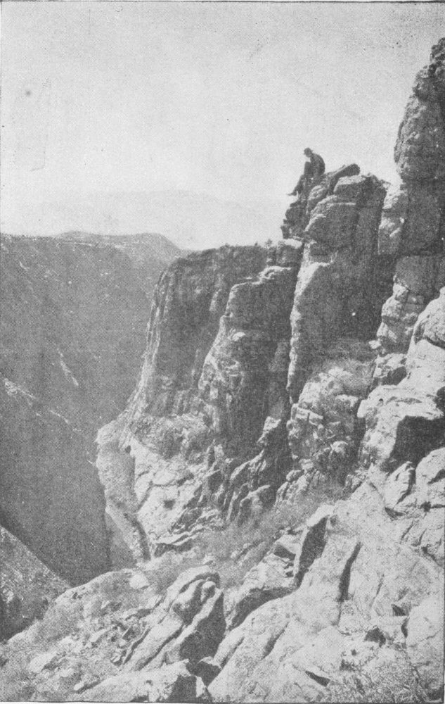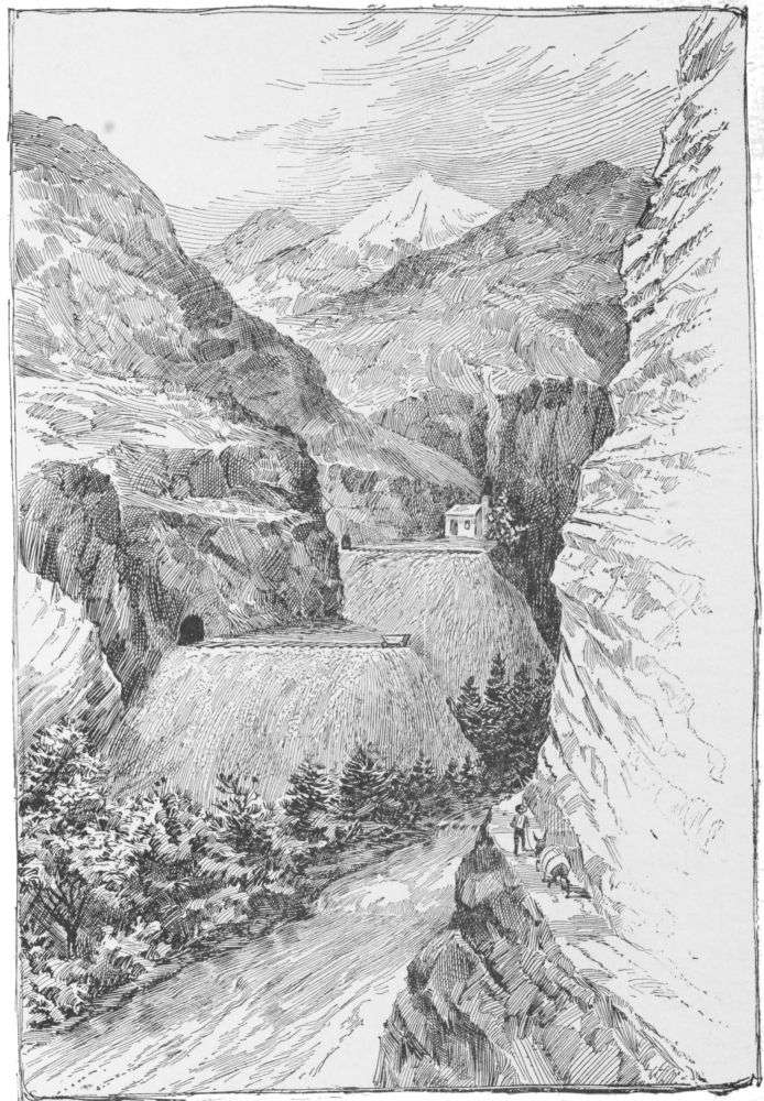 Beyond the woods the party found itself on the brink of a deep gorge, at the bottom of which Panther Creek tore down in a series of cascades. The torrent ran four or{10} five hundred feet below, and above them the mountains rose to invisible heights. Along this cliff-face the narrow trail had been carried irregularly and often very dangerously, but the hardy little beasts picked their way cautiously up and down, and never sank too deep in a bog or got too far over the edge of a precipice.