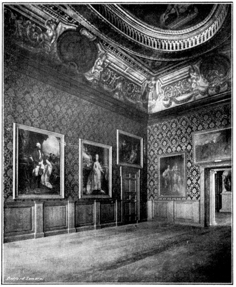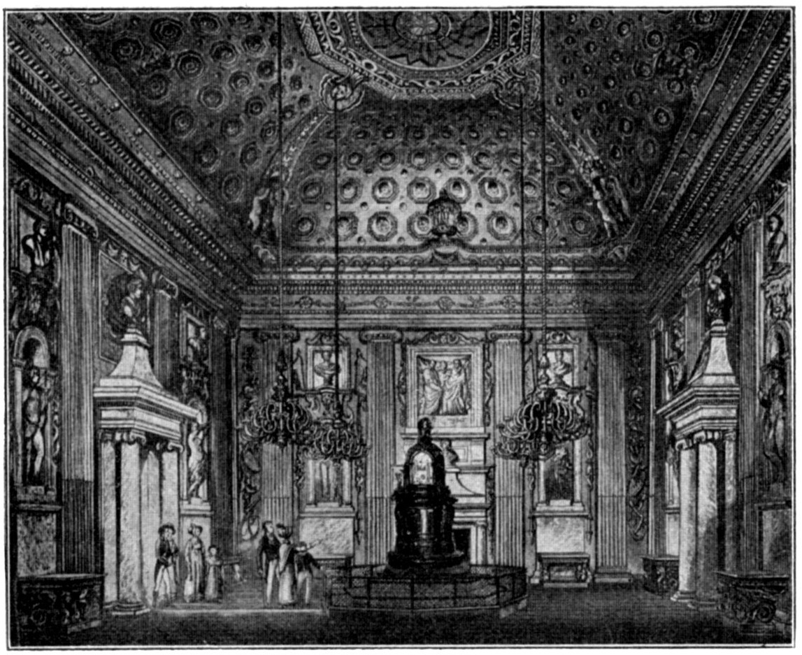 THE ceiling of the staircase being square and flat, it did not afford much scope for the exercise of imaginative design, and Kent was obliged to content himself with a very commonplace pattern—sufficiently apparent in the accompanying plate. In the four corners are a sort of double oblong panels, with similar square ones intervening between them. The ground colour is gray. The oblongs are painted with ornamental scroll-work and horses’ heads, the squares with human heads. These panels are bordered with very heavy projecting frames of plaster work, white and gilt, as is also the great square compartment in the middle. The panel of this last is painted with a representation of a circle, within which are four semicircular spaces or apertures, apparently intended to portray a pierced dome with galleries—but they are all in quite impossible perspective. In three of these spaces are seen musicians playing on various instruments, and spectators looking down upon the company below. In the fourth “the painter,” says Pyne, “has introduced his own portrait, holding a palette and pencils, with two of his pupils, who assisted him in the decoration of the walls, and a female of a very pleasing countenance, which is supposed to be a resemblance of an actress with whom he lived in the habits of peculiar friendship, and to whom he left a part of his fortune.”