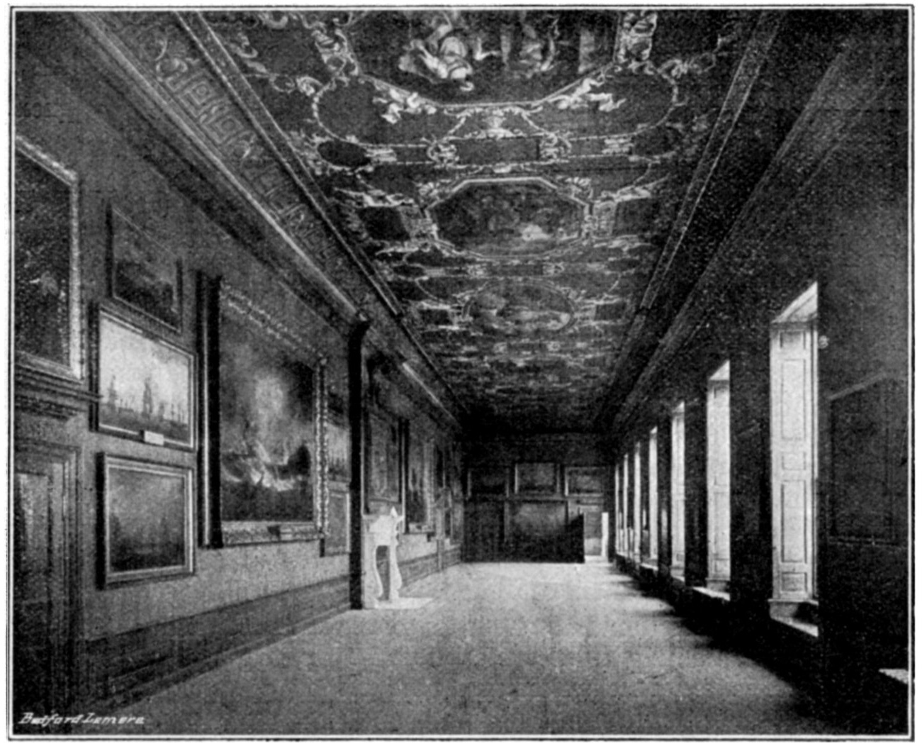 No one who did not see this staircase before the restorations were begun can conceive the woeful state of dust, filth, decay and rot which it then presented. With the fine iron balusters broken, damp oozing from the walls, the paintings indistinguishable from incrustations of smoke, and strips of the painted canvas hanging from the walls in shreds—it seemed impossible that it could ever be restored to its pristine splendour. The visitor must judge for himself whether this result has not been triumphantly accomplished.