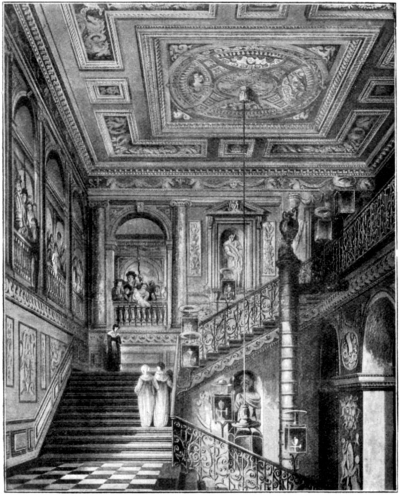 Our illustration, taken from Pyne’s drawing dated 1818, shows these lanthorns still in it. Except for these, which disappeared a long time ago, and the tall German stove, which was only removed a few months ago, the staircase appears exactly the same to-day.