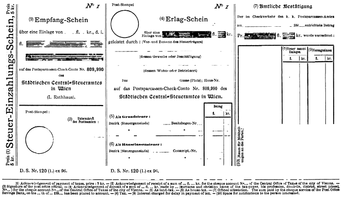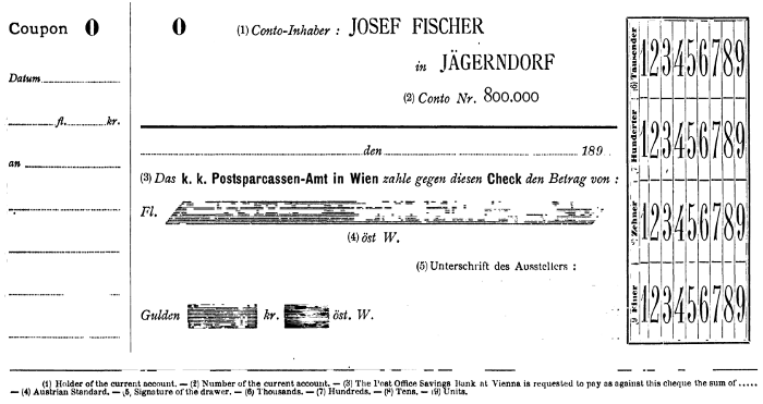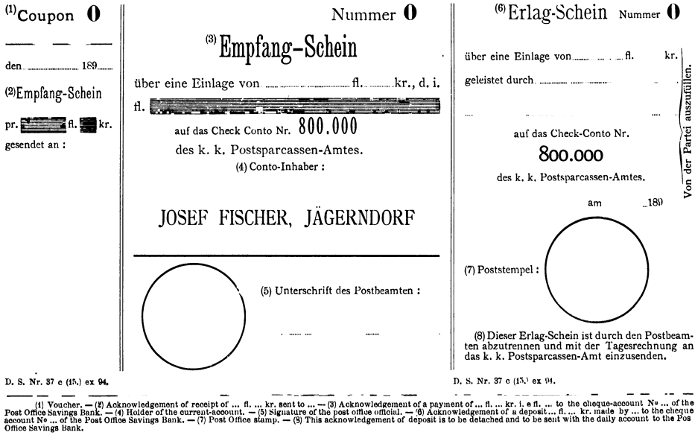 The instruments intended to facilitate the two classes of operations in which the Savings Bank and the Postal administration will intervene in the interest of the adherents:—the collection on behalf of the latter, the payments in or the payments in discharge are the object of special bye-laws. In this direction still, and in this direction especially we shall be able to learn from experience. Perfected instruments, as the Empfang Erlag Schein, the certificate of payment in and of deposit, the cheque-books of payment and of clearing with the[Pg 95] ingenious measures taken to baffle every fraud have been well tried in Austria and Hungary and there would be no longer any peril in adopting them.