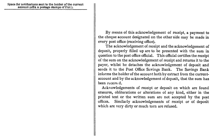 Each depositor will receive from the receiving office (Post office) where he pays in his first deposit, a deposit book in which each amount paid in, each amount paid back, and the interest added to the capital is to be entered. Each subsequent payment can be made at any receiving office (Post office), the amount being entered in the deposit book.