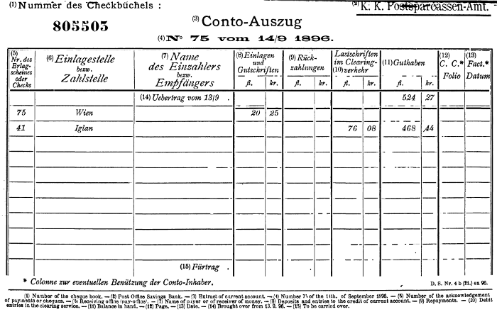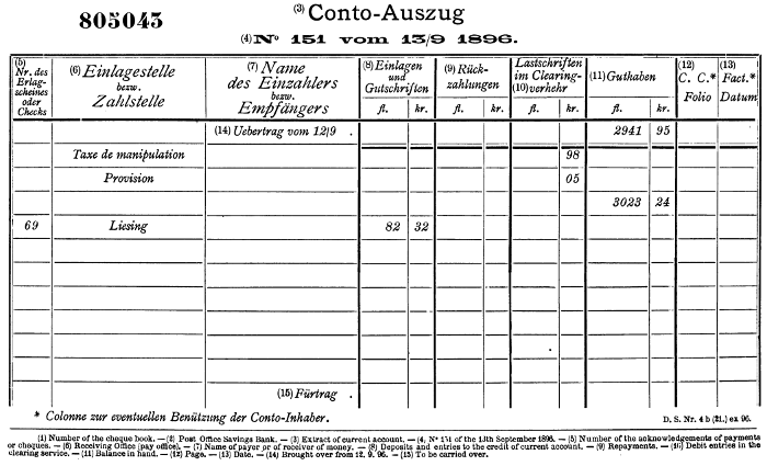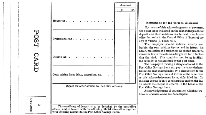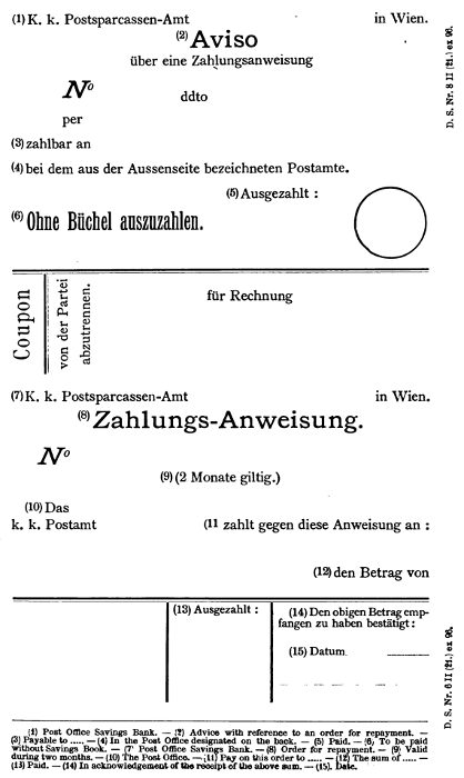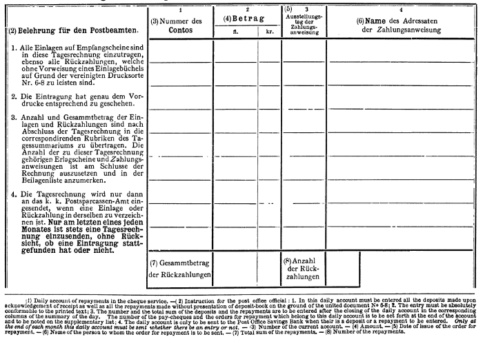 When such notice has been received with reference to sums up to 10 florins, the assignment will be sent by return of post by the Post Office Savings Bank and the payment back will be made by the receiving office (Post Office) immediately after its arrival.
