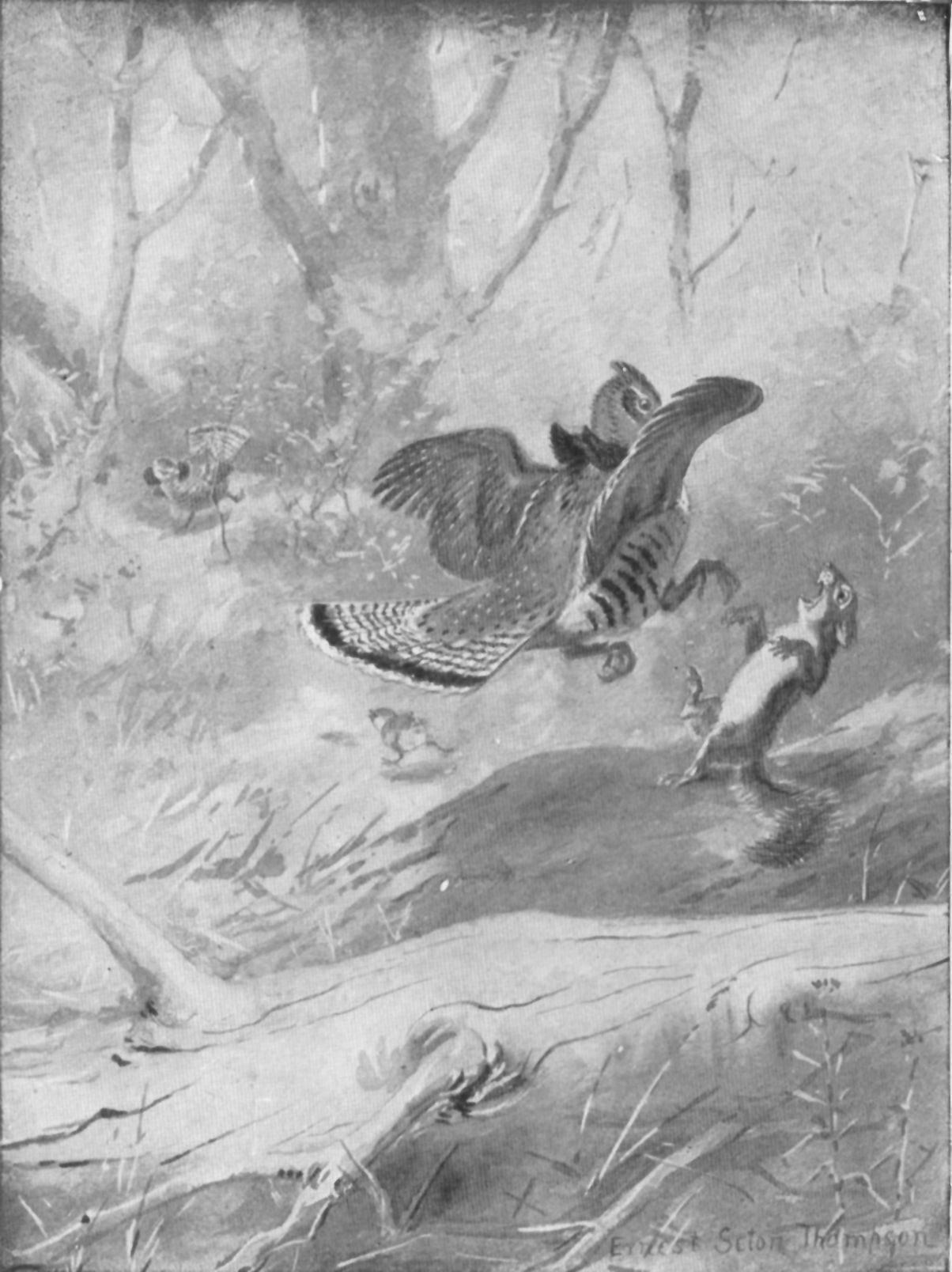 She walked slowly, crouching low as she went, for the woods were full of enemies. She was uttering a soft little cluck in her throat, a call to the little balls of mottled down that on their tiny pink legs came toddling after, and peeping softly and plaintively if left even a few inches behind, and seeming so fragile they made the very chicadees look big and coarse. There were twelve of them, but Mother Grouse watched them all, and she watched every bush and tree and thicket, and the whole woods and the sky itself. Always for enemies she seemed seeking—friends were too scarce to be looked for—and an enemy she found. Away across the level beaver meadow was a great brute of a fox. He was coming their way, and in a few moments would surely wind them or strike their trail. There was no time to lose.