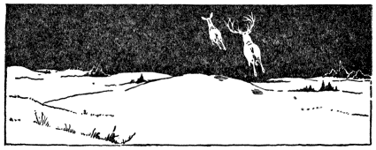 There was good camping here, the very spot indeed where, fifteen years before, Butler had camped on his Loneland Journey; but now the blizzard had ceased, so Yan spent the day hunting without seeing a track, and he spent the night as before, wishing that nature had been kinder to him in the matter of fur. During that first lone night his face and toes had been frozen and now bore burning sores. But still he kept on the chase, for something within had told him that the Grail[Pg 76] was surely near. Next day a strange, unreasoning guess sent him east across the creek in a deerless-looking barren land. Within half a mile he came on dim tracks made lately in the storm. He followed, and soon found where six deer had lain at rest, and among them a great, broad bed and a giant track that only one could have made. The track was almost fresh, the sign unfrozen still. "Within a mile," he thought. But within a hundred yards there loomed up on a fog-wrapped hillside five heads with ears regardant, and at that moment, too, there rose up from the snowy top a great form like a blasted trunk with two dead boughs still on. But they had seen him first, and be[Pg 77]fore the deadly gun could play, six beacons waved and a friendly hill had screened them from its power.