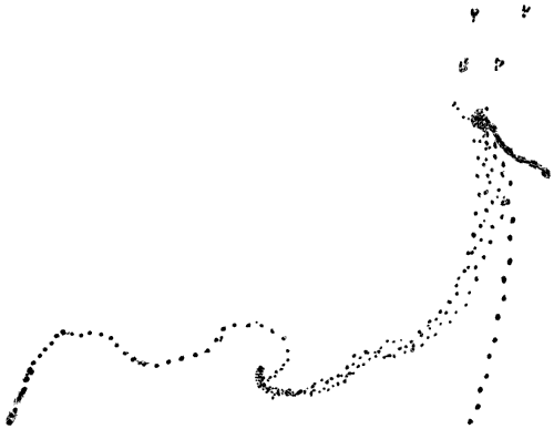 When they were gone he went to the place where they had begun their play. Here was one track; where was the next? He looked all around and was surprised to see a blank for fifteen feet; and then another blank, and on farther, another: then the blanks increased to eighteen feet, then to twenty, then to twenty-five and sometimes thirty feet. Each of these playful, effortless bounds covered a space of eighteen to thirty feet.