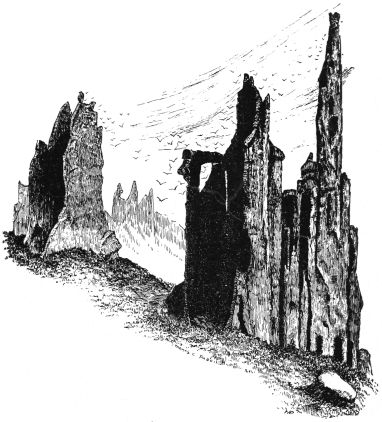 It is true that in earlier times, when they were weaker in number and skill at war, such reliance had not been disregarded. For once a host of giants and of monsters had attacked them from the hostile north, before whom all resistance had seemed utterly vain. And then a great wonder had taken place. The Manitou had turned his mountain face, even as the face of an Ægis, upon the invading bands, and straightway each and all had changed to stone! It was a terrible sight indeed for future enemies to behold that gorgonized army of granite giants standing athwart all paths approaching from the north or northeast, no longer besiegers, but unwilling and silent defenders whom no foe had yet found courage to approach. And though flood and tempest have overthrown and buried many of them,49 yet by Austin Bluffs and still more in the strange, grim forms which give name to the world-famous Monument Park, the routed remnants of that ancient army may still be seen, some standing defiant with shield and club uplifted to meet the crash of Death's petrific mace, some crouching in eternized horror at their impending doom.