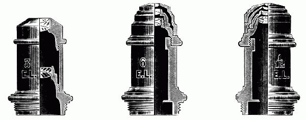 The Oil-immersion, represented by the last illustration consists of a front lens, hemispherical, behind which is a meniscus, which is in turn followed by a doublet and a triplet, these latter acting as the correcting lenses of the combination.