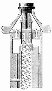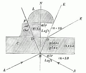 The above sketch may serve to make clear the advantages of the immersion objectives over those of the dry series. It is intended to represent diagrammatically a section through a cover-glass and the front lens of an objective, one half of the figure representing the conditions present in the case of the Oil-immersion, the other those which are present in the dry objectives. It will be noticed that by the interposition of a drop of oil of the same index of refraction as the glass between the cover-glass and the objective the refraction which occurs in the dry system when the light leaves the upper surface of the cover-glass is done away with. Since this second refraction is attended with much loss of light it must be evident, that in the immersion system a much greater quantity of light enters the objective than is possible, other things being equal, in objectives of the dry system.[10]