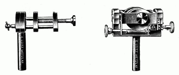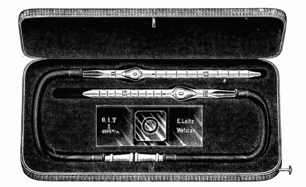 In making use of the higher power objectives—from No. 5 on—it should be remembered, that the lenses are corrected for cover glasses of 0,17 mm in thickness and for a microscope tube-length of 170 mm. When using the oil-immersion objectives it is particularly desirable, that this exact tube length should be employed. With a view to facilitate the adjustment of the tube-length the draw tubes of all our larger stands are graduated in millimeters, the scale[9] indicating the exact length of the microscope tube in any given position of the draw tube. In this connection it should be remembered, that the width of the collar of the nose-pieces is 15 millimeters, and that consequently, when a nose-piece is attached to the tube the reading of the draw tube scale should be 155 mm instead of 170 when the adjustment is proper.