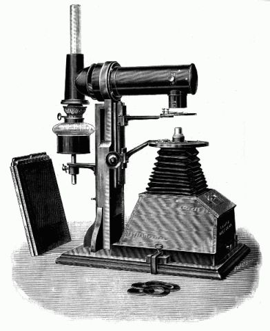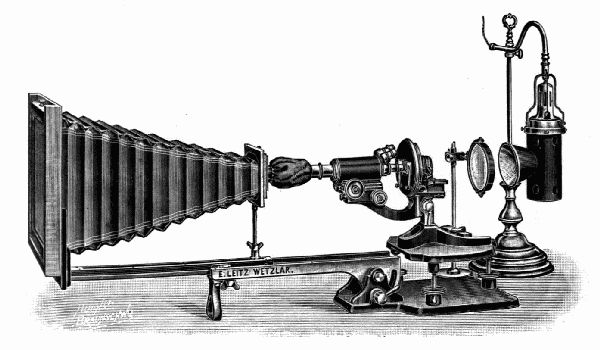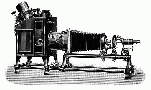 5. Photo-micrographic apparatus for use in horizontal and vertical position, having joint for inclination, large size bellows and plateholder.