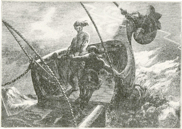 “Not as a thief did I enter thy halls, O King,” replied Frithiof proudly. “Had I come to seize thy Queen, who could have withstood me? ’Twas but to behold once again her who before the altar gave me her betrothal kiss. But ah, what slumbering fires my rashness hath awakened! Too long already have I tarried. Upon my head the gods have poured their wrath. Even the gentle Balder, lover of all mankind, spurns my prayers. ’Twas I who burned his temple. ‘Wolf in the Sanctuary,’ am I called. All joy ceases when my name is spoken. The child clings trembling to its father’s knees. Once more will I seek the broad, free ocean, whither earth and man have banished me. Out, out, my dragon! Too long in idleness thou hast lain. Again to the storm wind shalt thou spread thy pinions, and bathe thy black breast in the dashing spray! All—all on earth is lost to me forever; the tempest’s roar, the clash of arms shall whisper comfort to my soul once more! So will I live, so will I fighting fall; and mounting then to Odin’s throne, the gods, appeased, shall speak my pardon.”