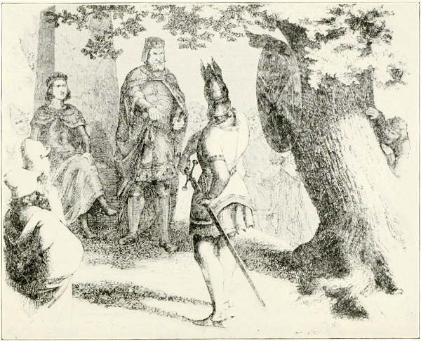 Here Halfdan entered through the doorway and with doubtful glance lingered on the threshold of the temple. But Frithiof unbuckled Angurvadel from his side and placed it with his shield against the altar. Unarmed he approached his enemy and said kindly: