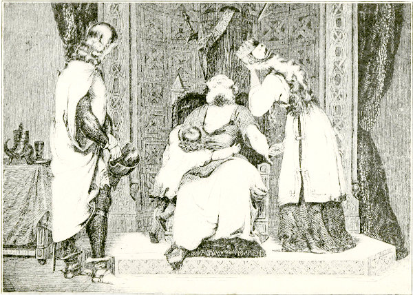 Pale on his throne sat the aged monarch, for he felt his end approaching. Ingeborg, trembling, stood beside him, and a circle of silent warriors stood about the royal pair. Sorrowfully Frithiof entered to say farewell.