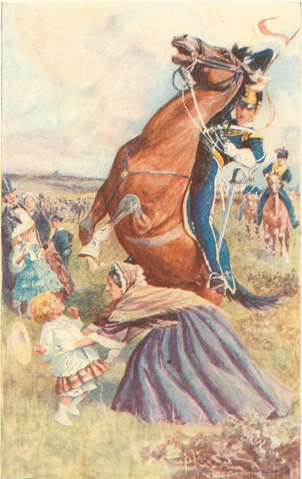 ‘Not at all,’ cried a voice from behind, and Jack saw Colonel Norreys and the adjutant. ‘Blair,’ continued the colonel, shaking hands with Jack, ‘I’m happy to welcome you as a brother-officer; you’re an{384} honour to the regiment. Come over to the mess; there’s some one there waiting to see you.’