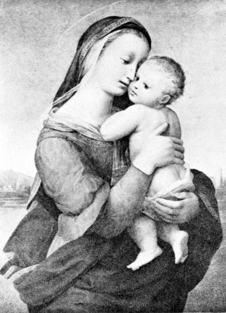 The Christ-child of the Tempi painting is a dimpled baby shyly nestling against his mother’s breast; the Sistine Child is a royal messenger lightly enthroned upon the Madonna’s arm. In one conception, Mother and Son are absorbed entirely in each other; in the other, they think only of their mission to humanity, their wide eyes searching the future with far-seeing gaze, and their thoughts intent upon the coming of the heavenly kingdom.