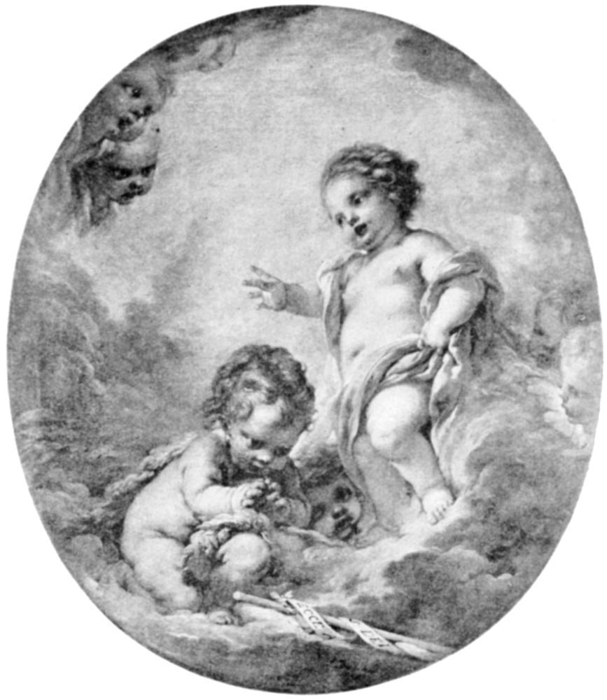 Such, for instance, is Boucher’s painting, thoroughly characteristic of the artist, and, when considered in itself, a very pretty thing. The two plump babies are bewitching little figures, irresistibly lovable in their dimpled beauty. Sweet cherub faces peep [Pg 157] from the surrounding clouds, regarding the holy children with wondering awe.