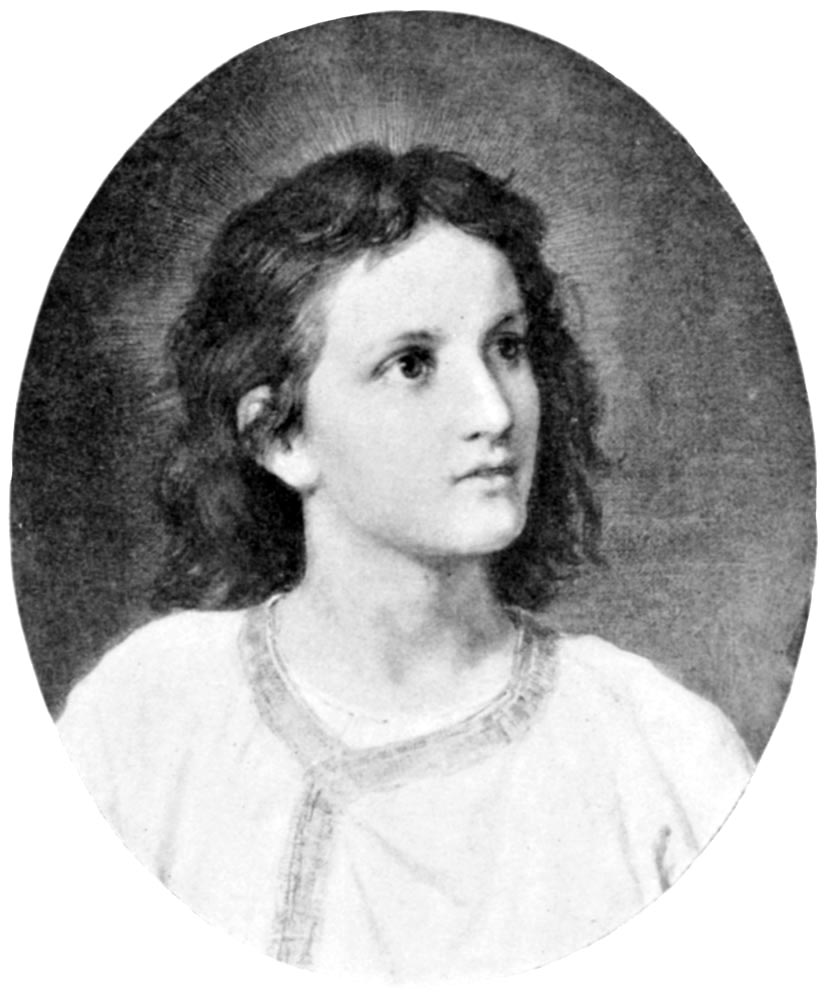 Professor Deger’s picture expresses a unique and lovely conception of the Christ-child in the fields, communing with his Father, and preparing for his ministry. He is a dreamy-looking boy, of delicate features, and broad, high brow, with fair curls blowing away from his face. Though alone, he lifts his hand in blessing, as if, in his prophetic imagination, the meadows were already peopled with the throngs to whom he is to teach the sweet lessons of the lilies and the sparrow.