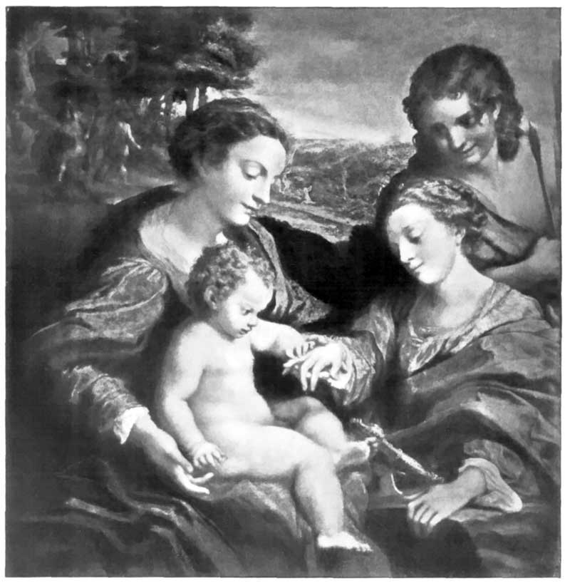 3. The Marriage of St. Catherine. Date, according to Meyer, 1517-1519; according to Ricci, after 1522. Painted for the Grillenzoni family of Modena. After several transfers it came into the possession of Cardinal Mazarin, from whose heirs it was acquired for Louis XIV.'s [xii]collection and hence became a permanent possession of the Louvre Gallery, Paris. Size: 3 ft. 5-1/3 in. by 3 ft. 4 in.
