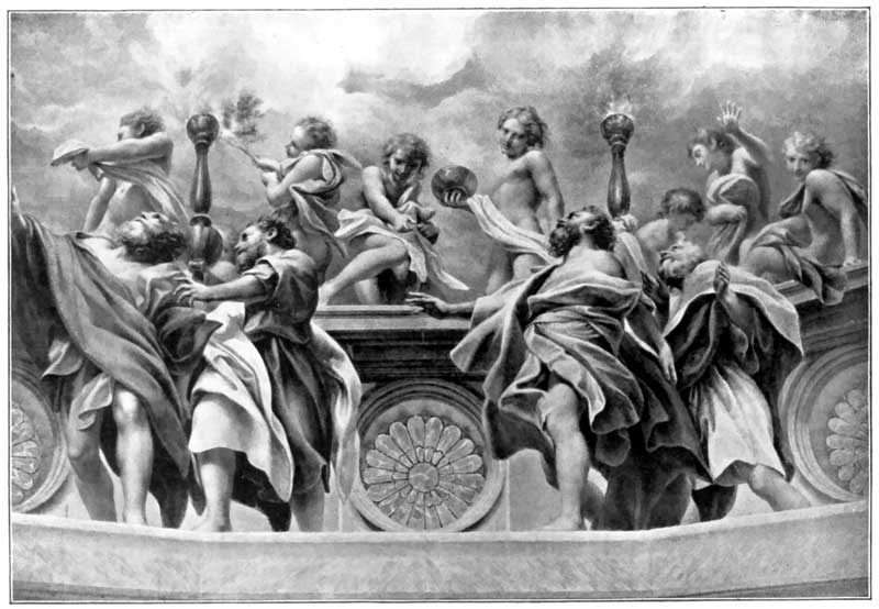 It is a curious fact that two artists of such opposed natures—the one so light-hearted, the other burdened with the prophet's spirit—should have so much in common in their decorative methods. Both understood the decorative value of the nude, and found their supreme delight in bodily motion. In a common zeal for exploiting the manifold possibilities of the human figure, the two fell into similar errors of exaggeration. In point of design Correggio cannot be compared with Michelangelo. He was utterly incapable of the sweeping lines characteristic of the great Florentine. He seldom achieved any success in the flow of drapery, and often his disposition of folds is very clumsy.