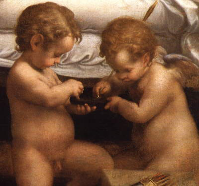 15. Cupid sharpening his Arrow. (Detail of Danaë.) Ordered (1530-1533) by Federigo II., Duke of Mantua, as a gift for the Emperor Charles V. After passing through many hands it came in 1823 into the possession of the Borghese family, and is now in the Borghese Gallery, Rome. Size of whole picture, 5 ft. 4 in. by 6 ft. 5 in.