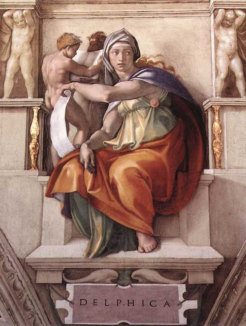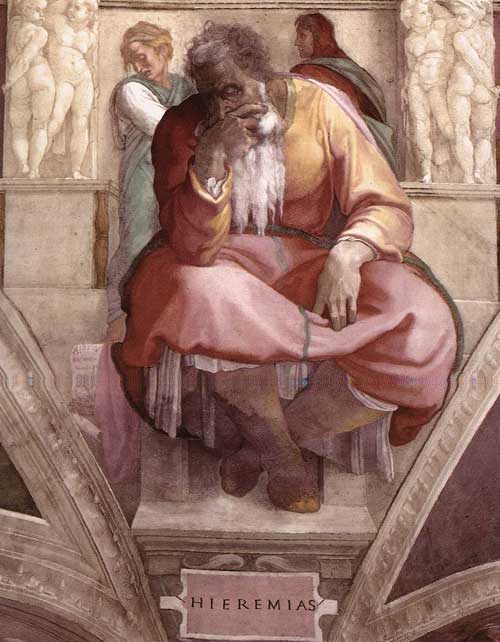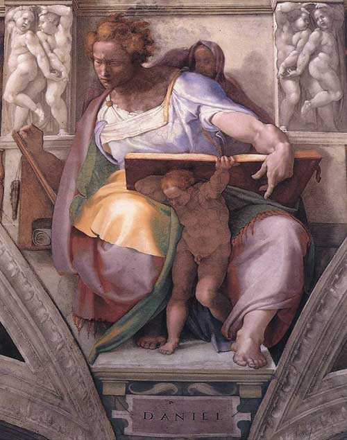 8-12. The Creation of Man, Jeremiah, Daniel, The Delphic Sibyl, the Cumæan Sibyl, frescoes on the ceiling of the Sistine Chapel, Rome, begun in 1508 at the order of the Pope [xv]Julius II. Michelangelo undertook the work reluctantly, as sculpture was his chosen art. The architect Bramante first made a scaffolding for the work, so clumsily constructed that Michelangelo replaced it by one of his own invention. Several Florentine painters were engaged as assistants, but, failing to satisfy the painter, returned. Julius II. often visited the chapel during the work, climbing to the scaffolding to see how it progressed. Impatient to see it, he gave orders to have the ceiling uncovered when but half finished. The first uncovering took place November 1, 1509. The work was completed October, 1512.