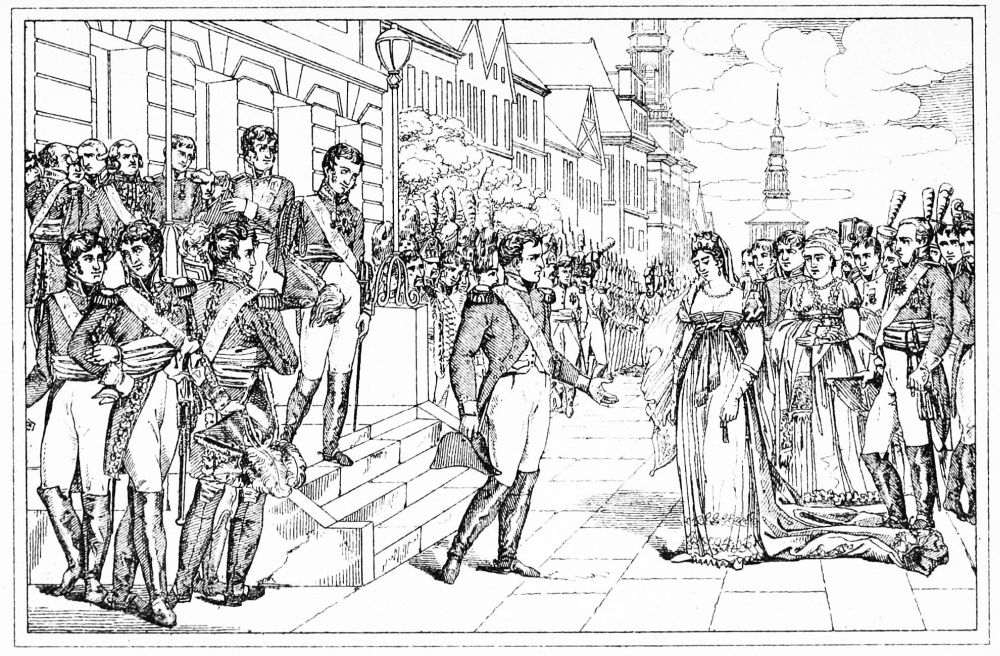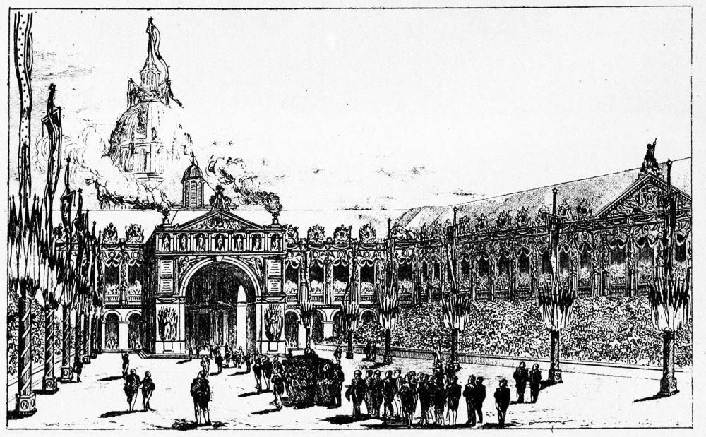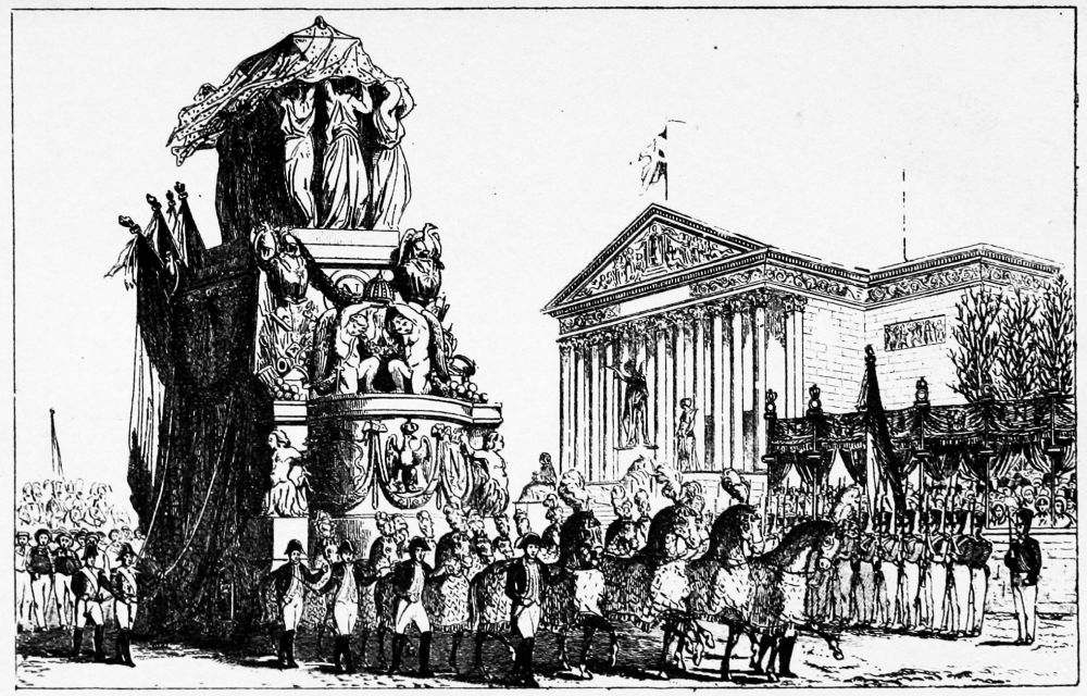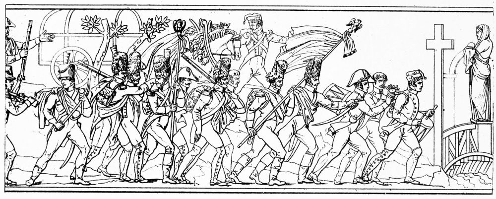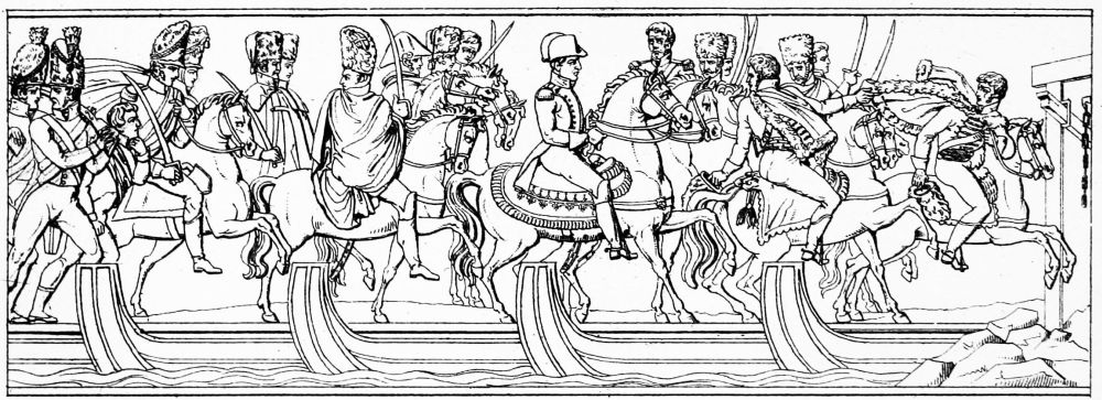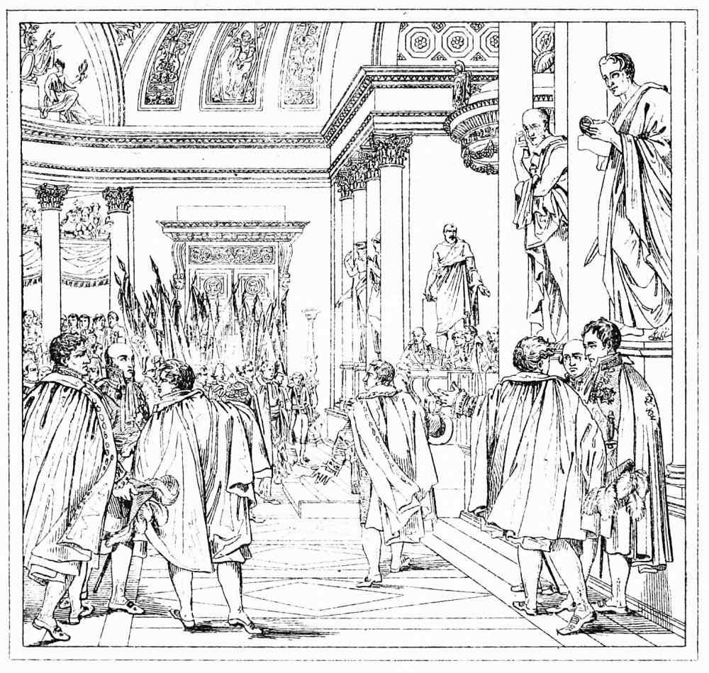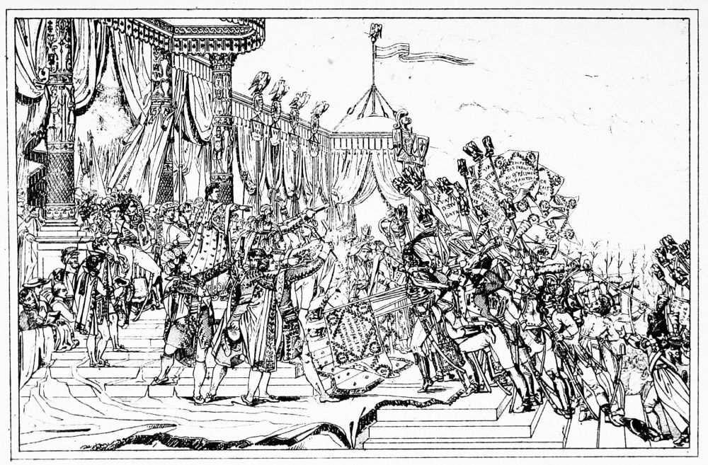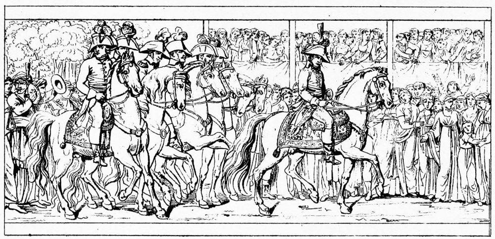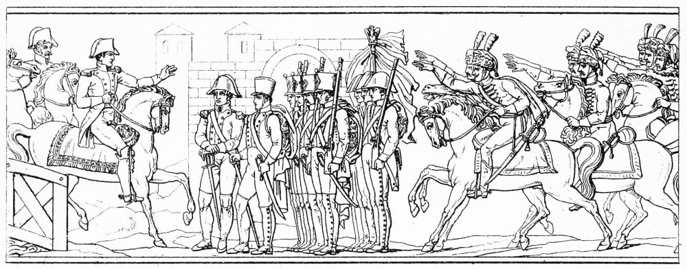 The accompanying engraving is copied from a fresco painted by Andrea Appiani, who was commissioned to portray in the vice-regal palace at Milan the pageants of Napoleon. Thirty-five are there painted in oil, after the manner of Grisaille. This subject has been engraved by the best artists of Milan; it is rare and much sought after by amateurs.{13}{12}