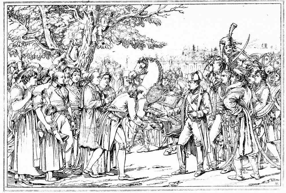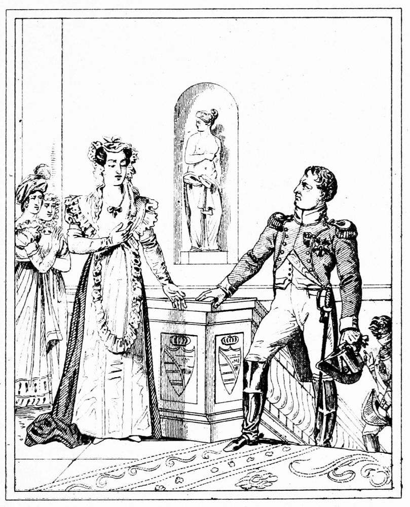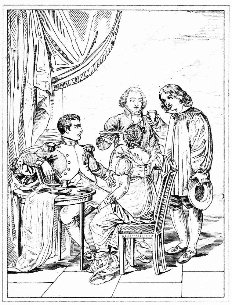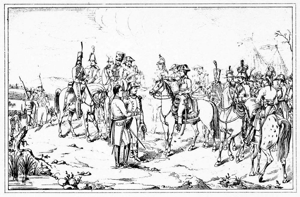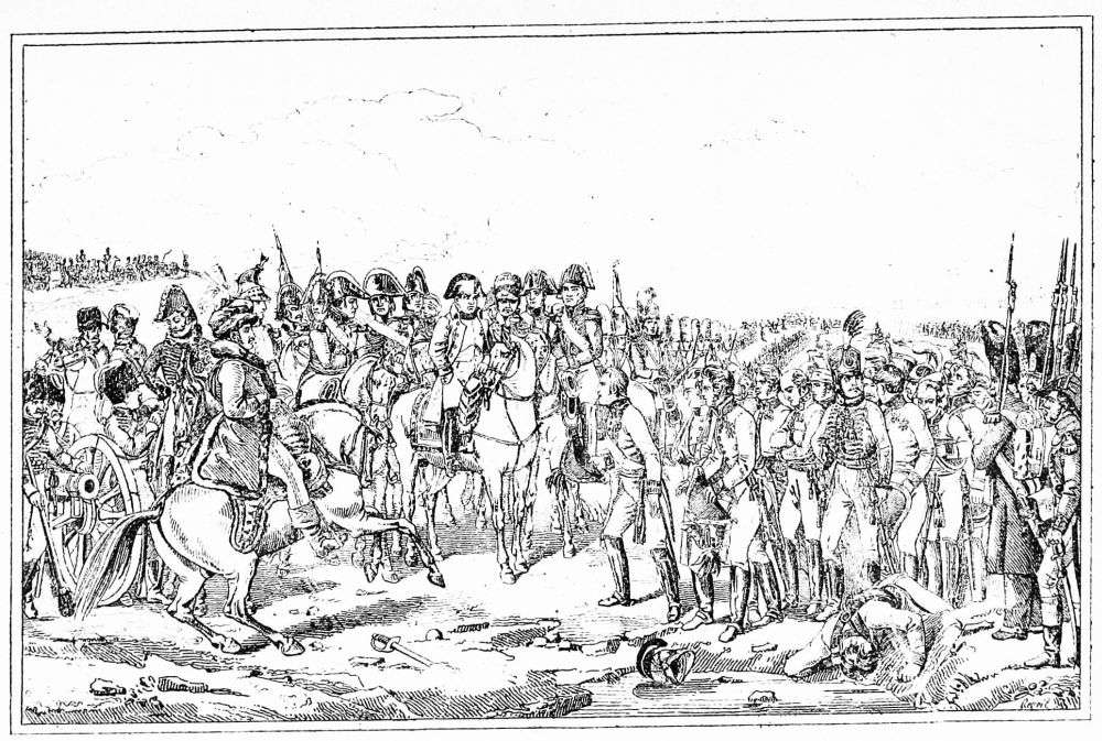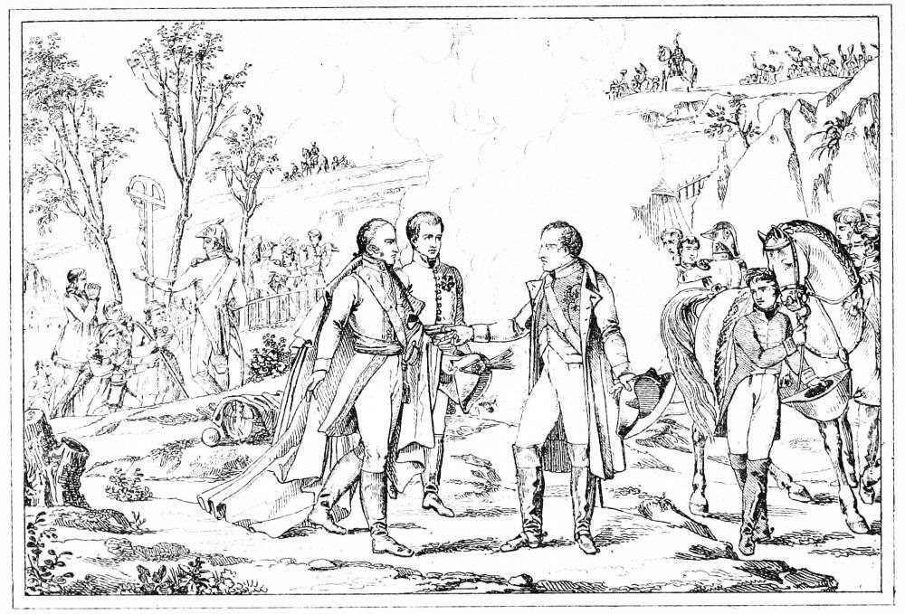 The scene in the picture is in a pavillion of the Bishop’s palace in the midst of a garden. The French general is saying to the Austrian envoys: “If we are not agreed upon that point, I continue my march, and behold the road to victory!”