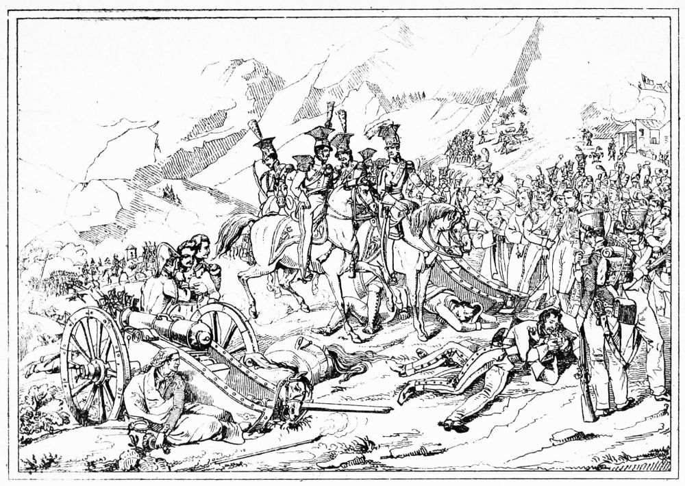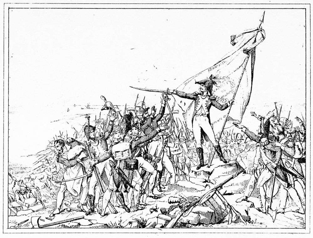 On the 10th of April, 1796, the central division of the enemy’s forces, commanded by General Argentan, had taken its position before the redoubts of Monte Legino, which were defended by Colonel Rampon. During the night the republican troops completely surrounded Argentan. Rampon, with his regiment, and Laharpe attacked him in front; while Massena and Augereau attacked him in the rear and in the flanks. The rout was complete, and the French made their entry into Piedmont.{29}{28}