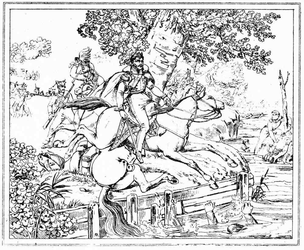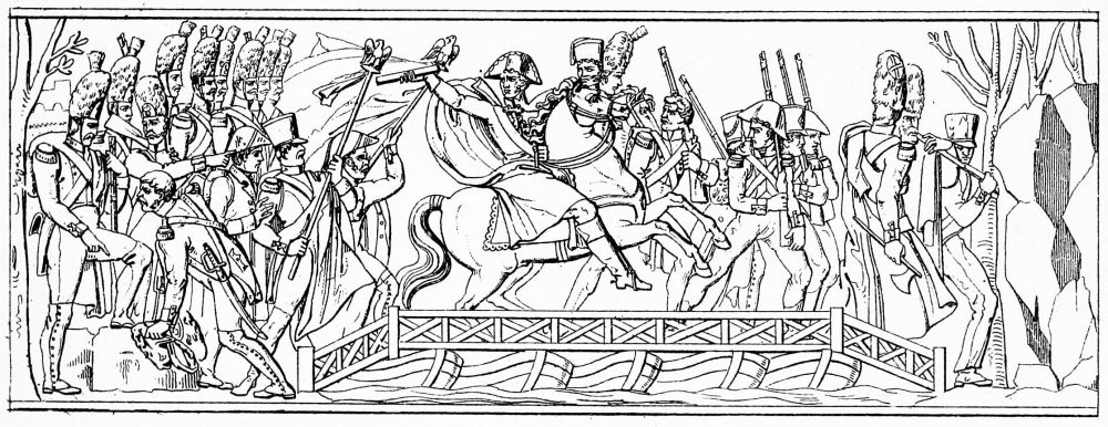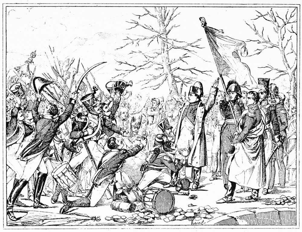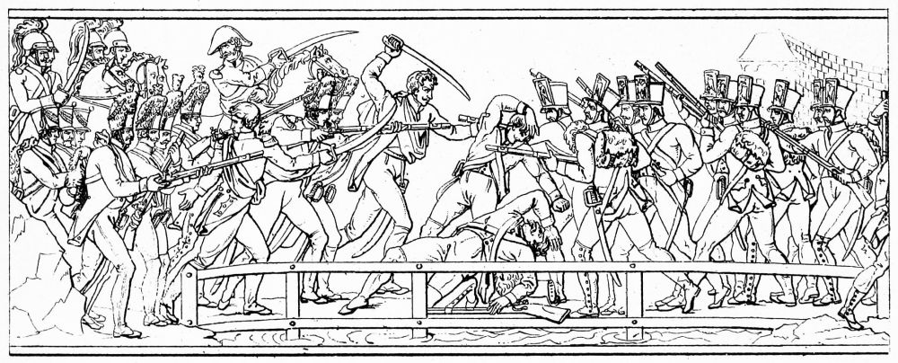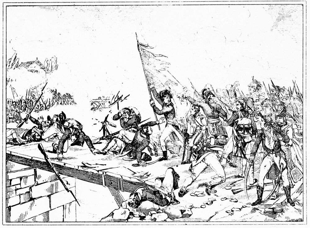 The marsh of Arcola is crossed by three causeways,—each of which was occupied by a French column. Alvinzi, supposing them only a few light troops, contented himself by ordering two small divisions to disperse them; these were checked and nearly routed by the strong columns of infantry to which they unexpectedly found themselves opposed. It was necessary that Arcola, which was defended by two battalions of Croates should be taken, in order to gain the bridge of Villeneuve, which was the only retreat of Alvinzi. The fire continuing unabated, Napoleon, determined on making a last effort, seized an ensign and planted it on the bridge with his own hand. He had advanced his column to the centre of the bridge, when a fresh body of Austrians arrived and commenced a sharp fire on his flank, which compelled those in the rear to retire. The grenadiers at the head of the column, finding themselves abandoned by their comrades, gave way; but not willing to lose their general, bore him in their arms through the midst of the dead and the dying. In the confusion he was precipitated into the marsh, where he lay surrounded by his enemies, and would probably have been taken prisoner had not the grenadiers, perceiving his danger, raised the cry, “Forward—forward—save the general!” At this the troops returned to the charge, and finally drove the Austrians out of the village. Nov. 1796.{37}{36}