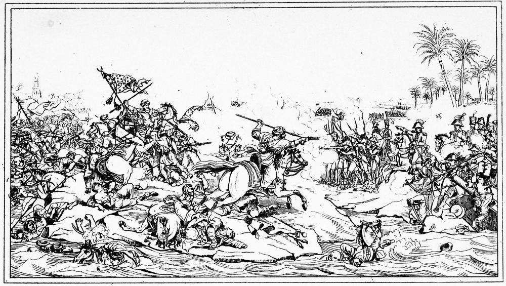 The Turkish outposts were assaulted early on the morning of the 24th of July, 1799, and driven in with great slaughter; but the French, as they advanced, came within range of the batteries and of the ships that lay close by the shore, and were checked. This might have ended in a rout, but for the undisciplined eagerness with which the Turks engaged in the task of despoiling those that fell before them—thus giving Murat the opportunity of charging their main body in flank with his cavalry, at the moment when the infantry, rallying under the eye of Napoleon, forced their way into the intrenchments. From that moment, the battle was a massacre. The Turks, attacked on all sides, were panic-stricken; and the sea was covered with the turbans of men who flung themselves headlong into the waves, rather than await the fury of Le Beau Sabreur, or the steady rolling fire of the Sultan Kebir. Six thousand surrendered at discretion; twelve thousand perished on the field, or in the sea.{89}{88}