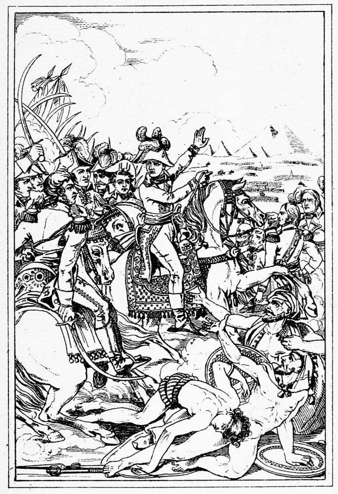 The subject of the accompanying engraving is derived from the account already given of the Battle of the Pyramids, at the moment when Napoleon, pointing to those remains of antiquity, and addressing his soldiers, exclaimed, “Soldats! du haut de ces pyramides, quarante siècles vous contemplent.” The results of this battle are well known, the name of Buonaparte, now spread panic through the East; and the Sultan Kebir or King of Fire, as he was called from the deadly effects of the musketry in this engagement was considered as the destined scourge of God, whom it was hopeless to resist.{45}{44}
