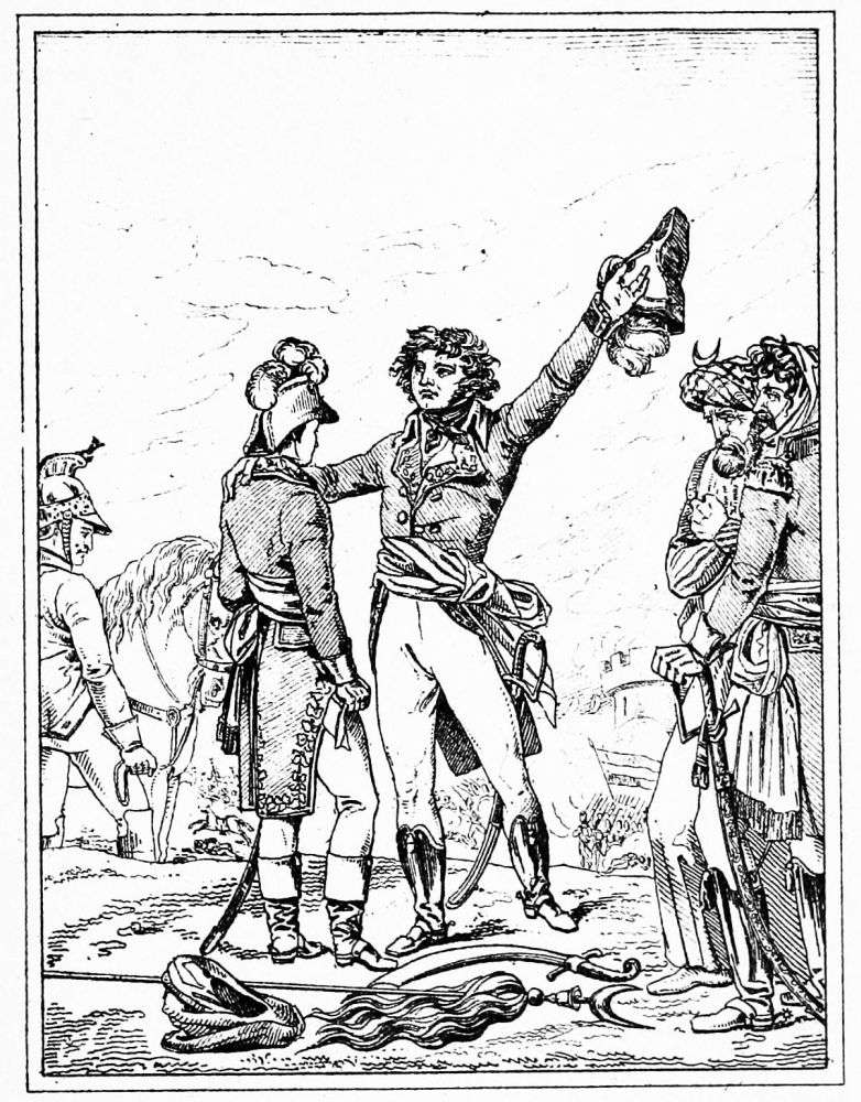 While the French were masters of Cairo, a conspiracy was formed against them which exploded on the 21st of October, 1798. The populace, at the instigation of the Sheiks, had sworn by Mahomet to exterminate the French. At the commencement of the insurrection, General Dupuy was mortally wounded, and several others were killed; when the drums were heard beating to arms, the Turks repaired to the Grand Mosque, where they assembled to the number of about 8,000. Here they were ordered to surrender, but refused, and seemed determined to defend themselves to the last, when Napoleon commanded bombs to be thrown from the citadel; this spread dismay and terror amongst the besieged, which was greatly increased by the French bursting open the doors. In a few moments the carnage became dreadful. The fanaticism of the revolters prevented their perceiving the impossibility of successful resistance to the French, who had been infuriated by seeing Brigadier-General Sulkowski slain by the multitude. Girodet has produced a very animated picture of the scene. The most remarkable group is that where a man completely naked supports a young Turk, richly dressed, who is about to receive his death-wound. Near him is a negro, also naked, aiming to ward off the fatal blow, and holding the head of a young Frenchman. On the left is an Hussar of extraordinary stature, whose weapon seems to threaten death to the unfortunate Turk.{49}{48}