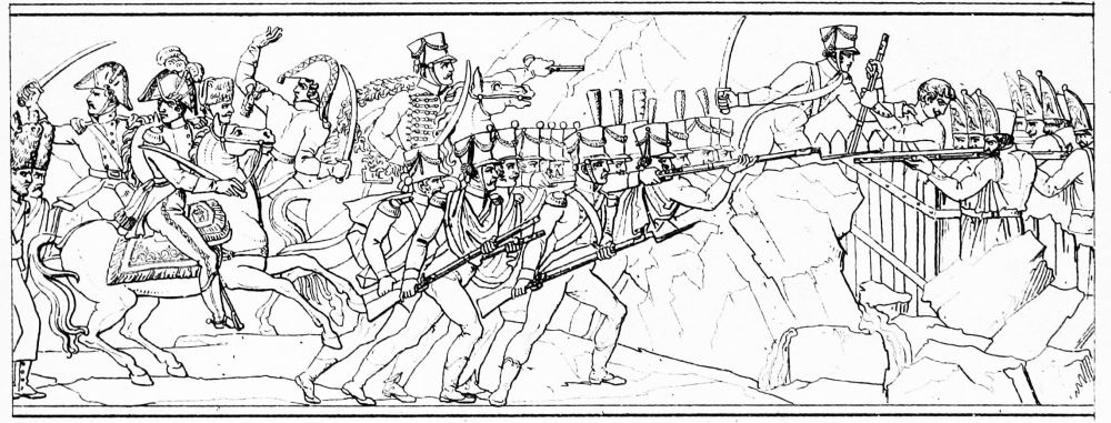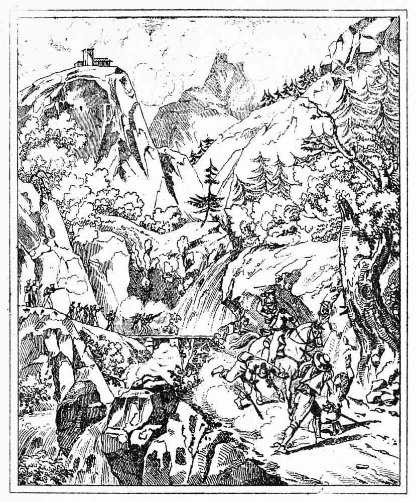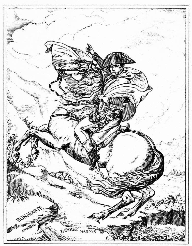 On the 15th, at the head of 30,000 of his troops, Napoleon began the ascent of St. Bernard. From St. Pierre to the summit the trail was so narrow that the troops were obliged to move in single file. In the course of a few days he performed what General Suvaroff had not dared to undertake in the preceding year: and thus the name of Napoleon was placed on the list with Hannibal and Charlemagne.{97}{96}