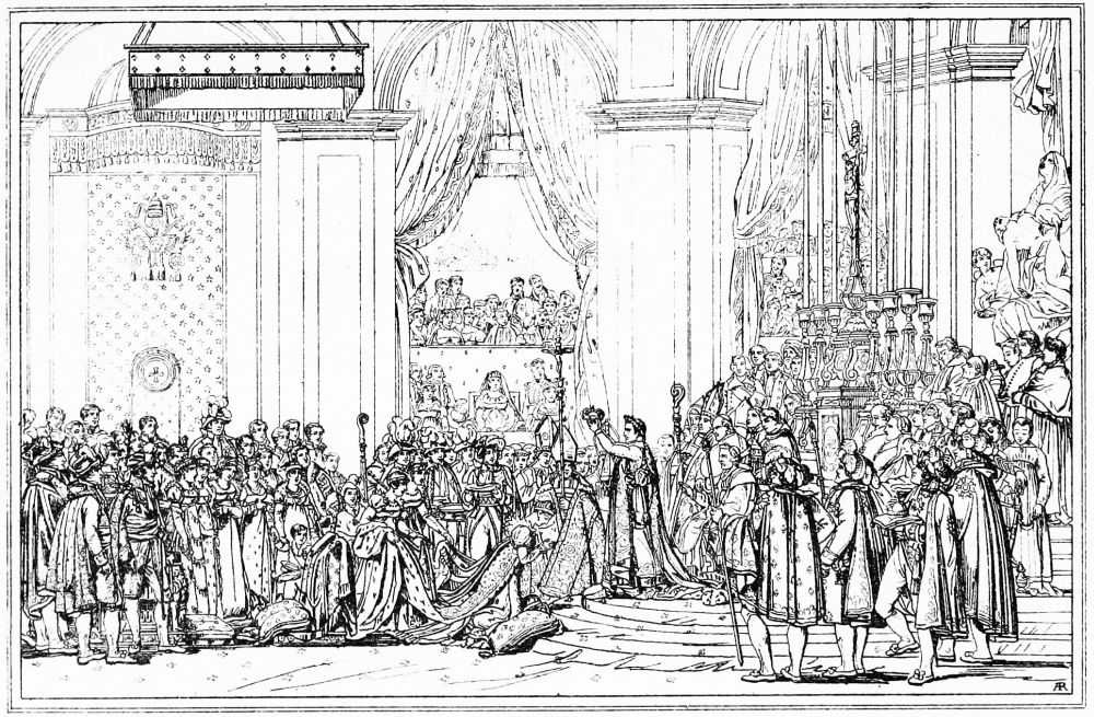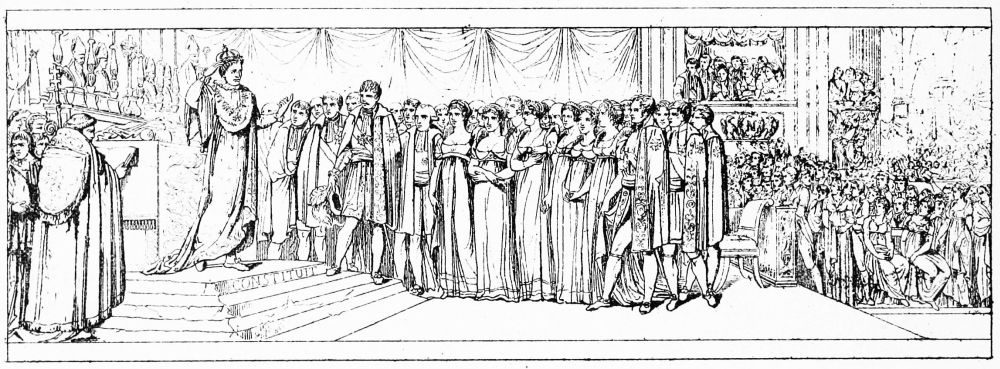 This imposing ceremony was performed on the 2d of December, 1804, in the Cathedral of Notre Dame, in the midst of all that was splendid and illustrious in the Capital of France. With a view to show his power rather than to acknowledge the jurisdiction of the Pope, either temporal or spiritual, Napoleon summoned Pius VII. to be in attendance on the day of his inauguration at Paris. In compliance with this, the unresisting Pope left Rome on the 5th of November, and blessed the Emperor and Empress, and also consecrated the diadems. Napoleon, however, placed the crown on his own head, and then on the head of Josephine, who received it kneeling on a cushion at the foot of the altar steps. We are told that “throughout the ceremonial his aspect was thoughtful; it was on a stern and gloomy brow that with his own hands he planted the symbol of successful ambition and uneasy power, and the shouts of the deputies present, sounded faint and hollow amidst the silence of the people.{105}{104}”