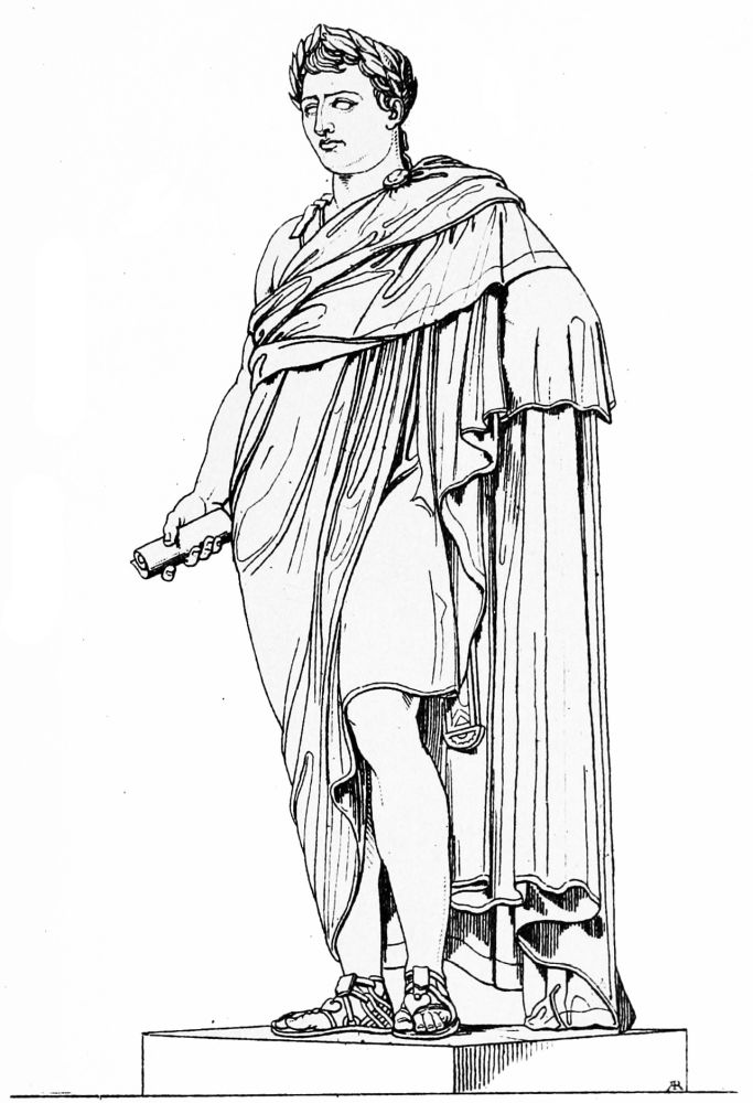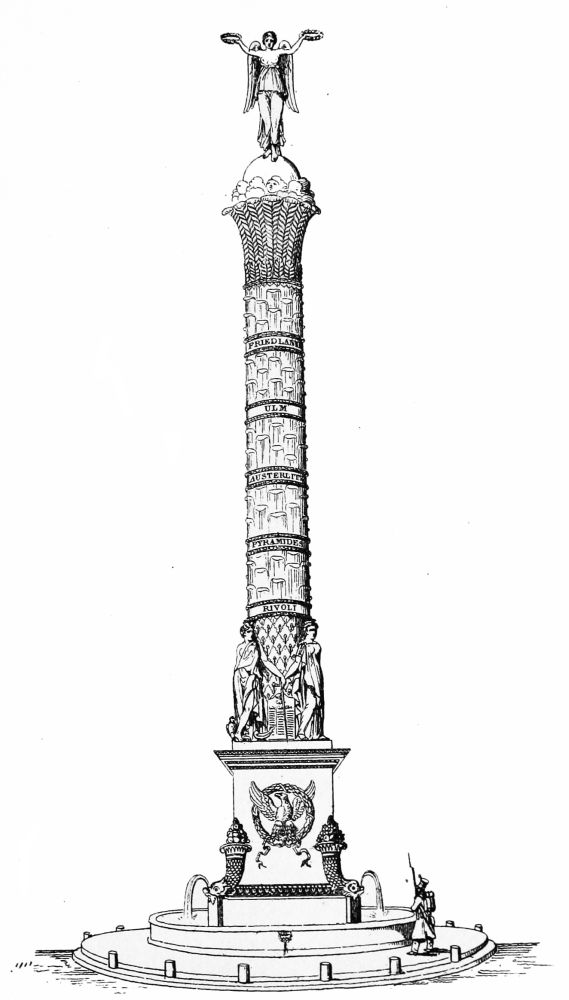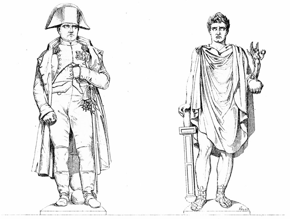 Napoleon was anxious to place his name on the list of those Emperors of old, whose names are rendered immortal, not so much by their own heroic or noble deeds as by the flattering notices of them in the deathless writings of poets and historians. On the occasion of his statue being first required for the Column which now stands in the Place Vendome, he directed that it should be attired as a senator of ancient Rome, and Chaudet produced the statue, of which the accompanying engraving is a faithful representation. It has since been replaced by one in military uniform.{349}{348}