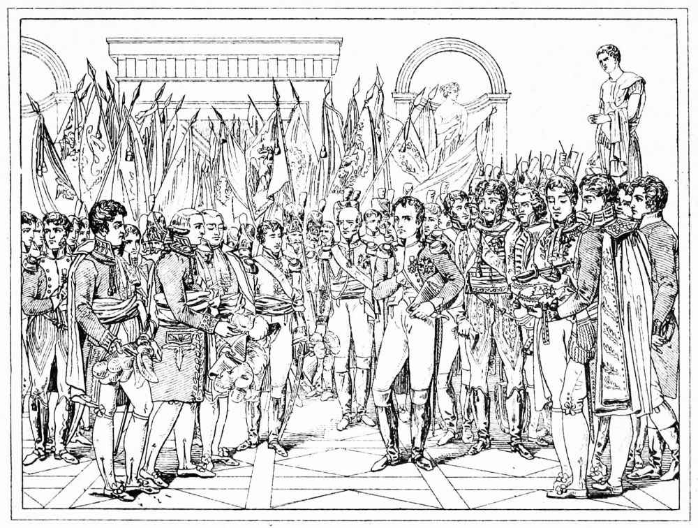 The picture contains some historical portraits; among others, Lavalette, aide-de-camp to Napoleon, who wrote under the dictation of his general; to the left of Lavalette are Louis Buonaparte and Eugene Beauharnais, leaning his head on the future king of Holland. There are also portraits of Berthier, Massena, Augereau, and Murat, then inseparable associates of Napoleon.{33}{32}