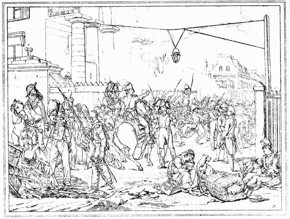 While everything portended a sanguinary affair, the danger becoming every instant more pressing, the Convention discussed the situation without coming to any decision. Suddenly a column of a few battalions headed by Lafond, an emigrant, appeared on Point Neuf, and obliged Cartaux to fall back under the posterns. At about a quarter past four some rockets were fired from the Hotel de Noailles. This was the signal for the attack. Lafond’s column wheeled round, and marched on the Pont Royal along the Quai Voltaire. This column was routed by the artillery of the Louvre and Pont Royal after rallying three times under the fire. St. Roche was taken, and every other post occupied by the sectionaries, was cleared. At six o’clock, the affray was over; and if a few cannon were heard during the night, they were discharged to destroy the barricades which some of the citizens still wished to maintain.{9}{8}