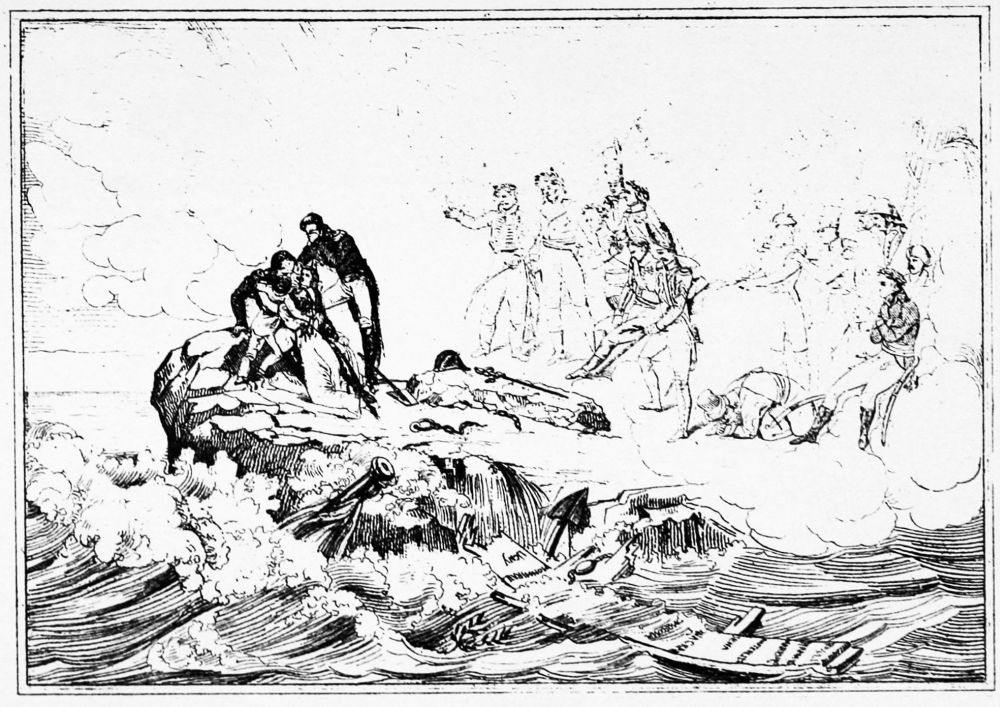 The conclusion of Napoleon’s remarkable history is here well conceived. The mound of earth surmounted by his cap and sword, points out the last earthly tenement of the ex-Emperor; the group upon that point of the rock which juts into the sea adds considerably to the interest of the scene; few have forgotten the faithful companions of Napoleon when prisoner at St Helena. The artist, Horace Vernet, has called poetry to his aid and introduced the shades of several of the departed comrades of Napoleon, who assisted him in gaining that fame which will ever attach to his character in the future history of European nations. Two aged minstrels placed on the right of the engraving, are supposed to be recounting the history of his various exploits.{353}{352}