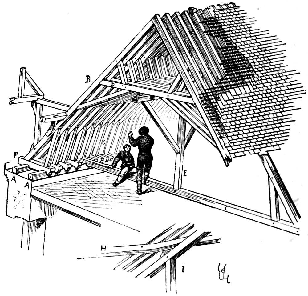 Ridge-pole (faîtage), horizontal piece of wood which, resting on the top of the king-posts of the principals, forms the apex of the roof and receives the rafters. The ridge-poles are supported in their bearing, from one king-post to another, by struts.