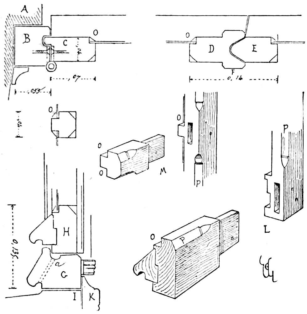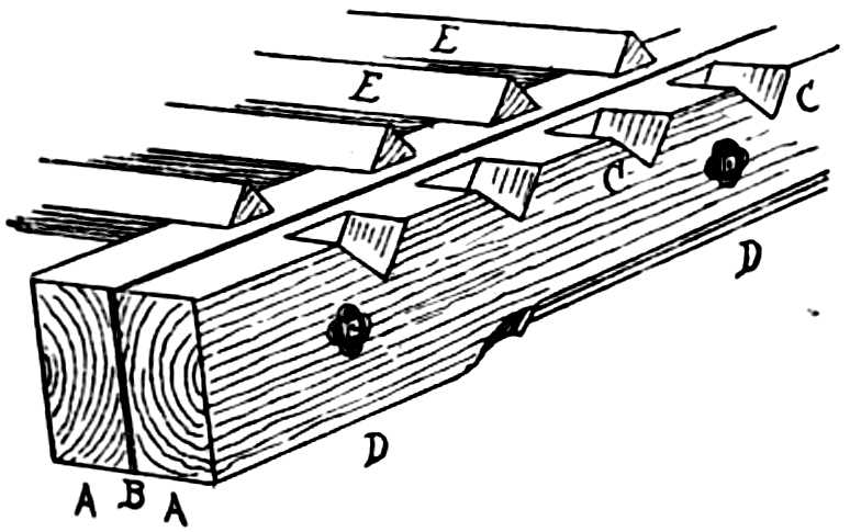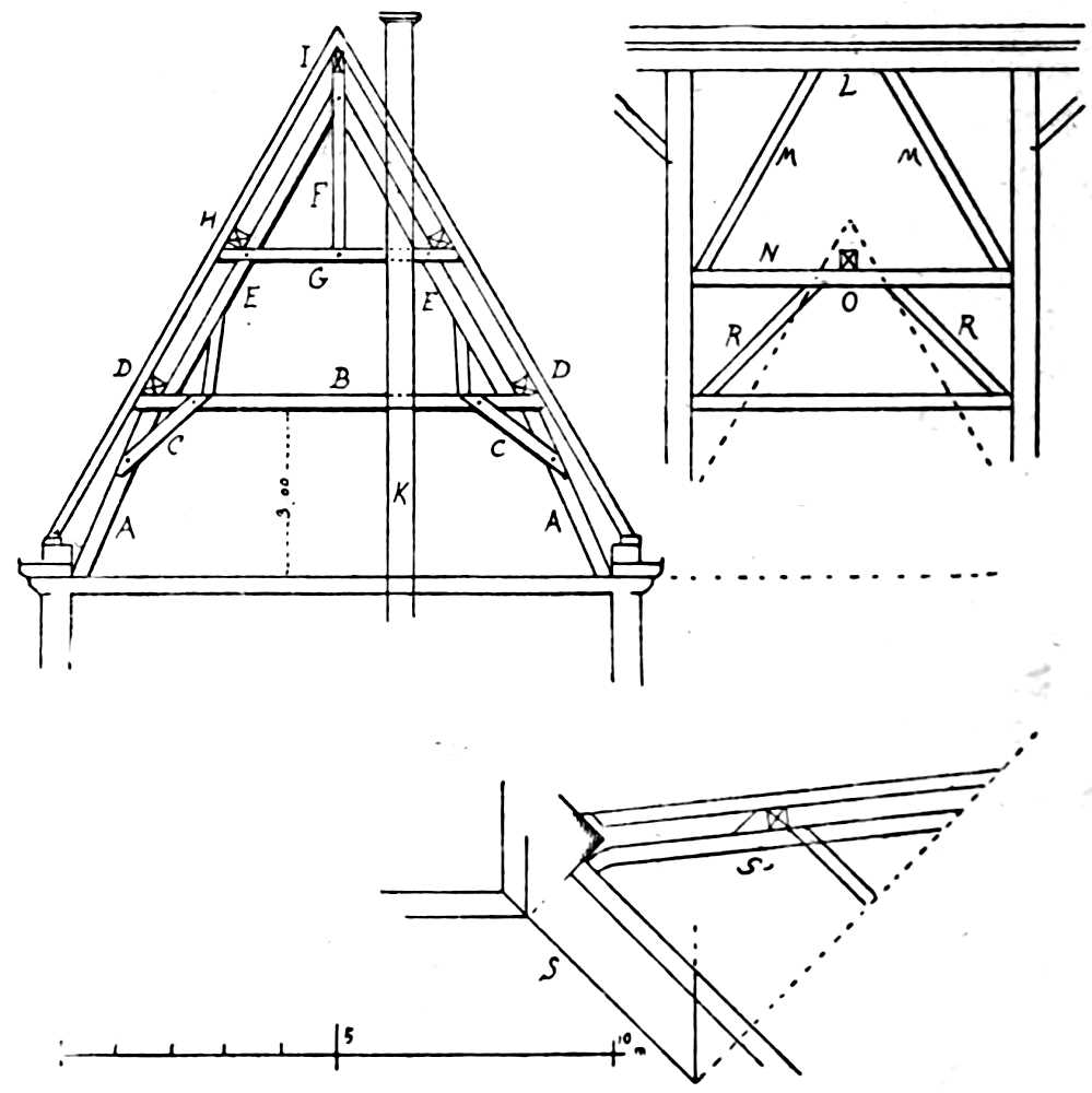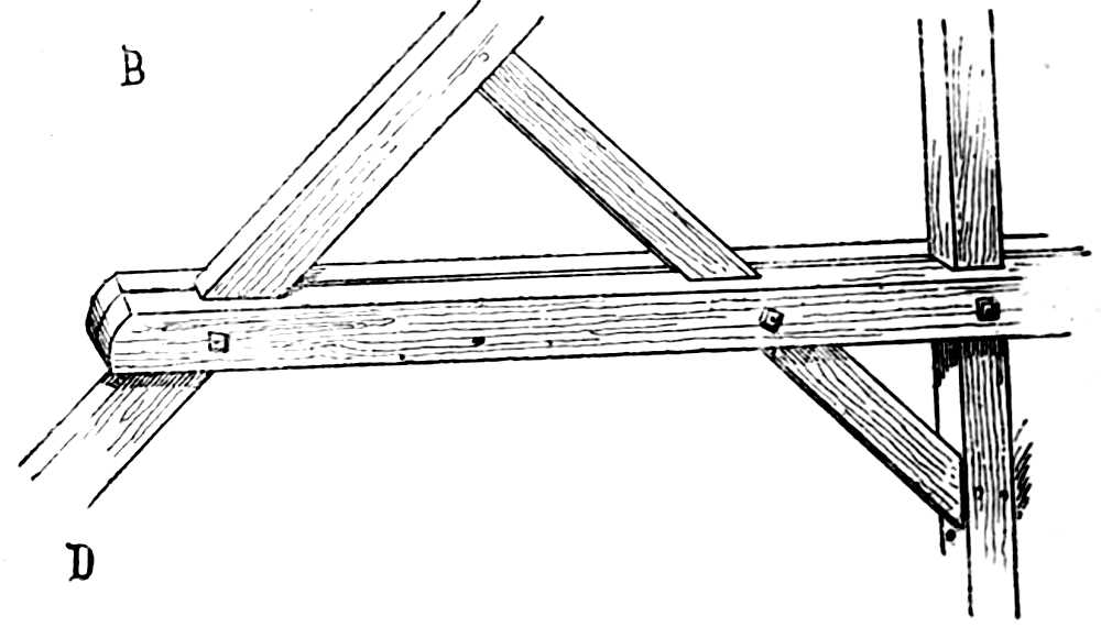 Blade, or Principal-rafter (arbalétrier), piece of timber inclined, according to the slope of a roof, which is joined at the[Pg 264] upper end into the king-post, at its lower end into the tie-beam, and which supports the purlins (see next page).