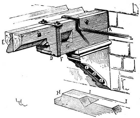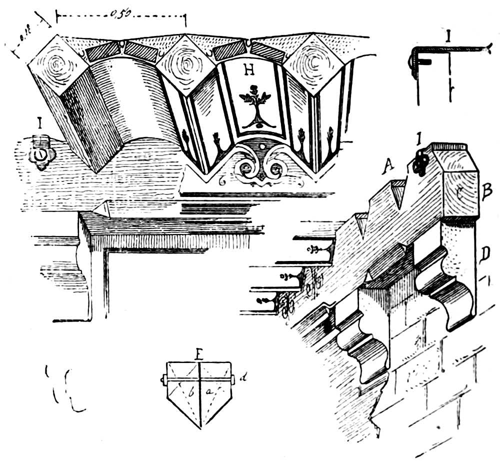 Corbel (corbeau), support of stone or wood projecting from the face of a wall, having its front moulded or carved, its sides vertical and carrying a beam, cornice, shaft, vault-springer, &c.
