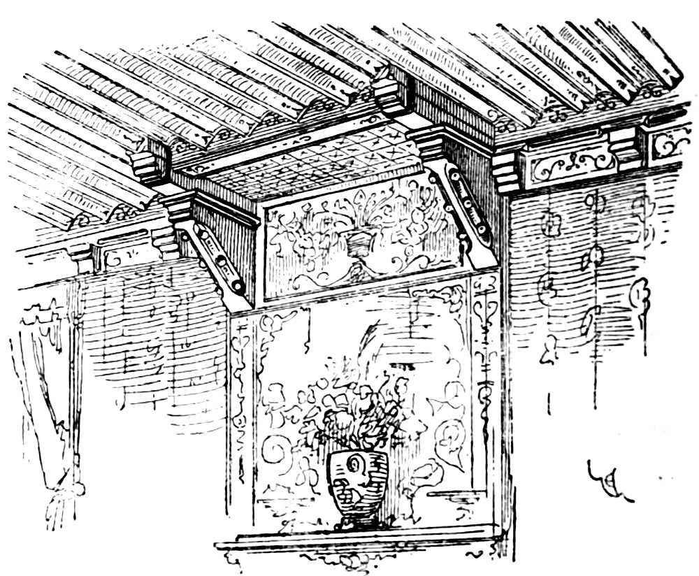 Trimmer (chevêtre), piece of wood which, framed into two trimmer-joists, receives the ends of the joists, the space of the[Pg 268] hearth-stone from the fireplace, or across the openings of doors or windows.