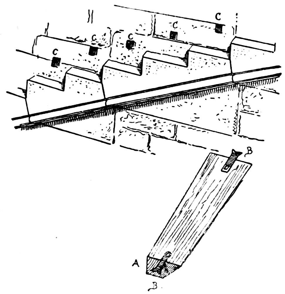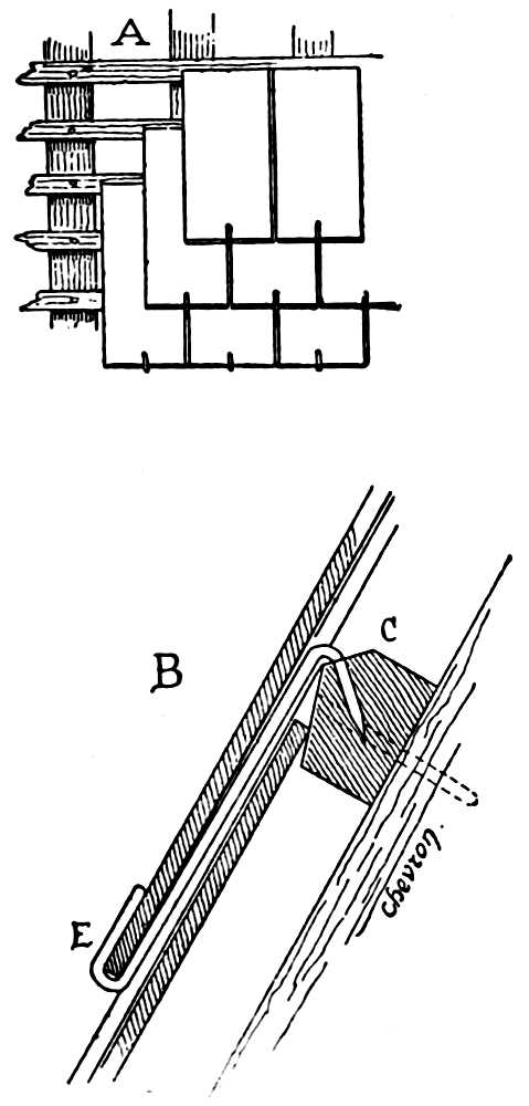 Rafter (chevron), piece of timber of small scantling, on which is nailed the boarding or laths which receives the slates or tiles. In good roofing rafters are placed 20 inches apart, centre and centre, at most. They rest at bottom upon wall-plates, or upon foot-pieces, in their length on the side-pieces or purlins, at their upper extremity against the ridge-piece.