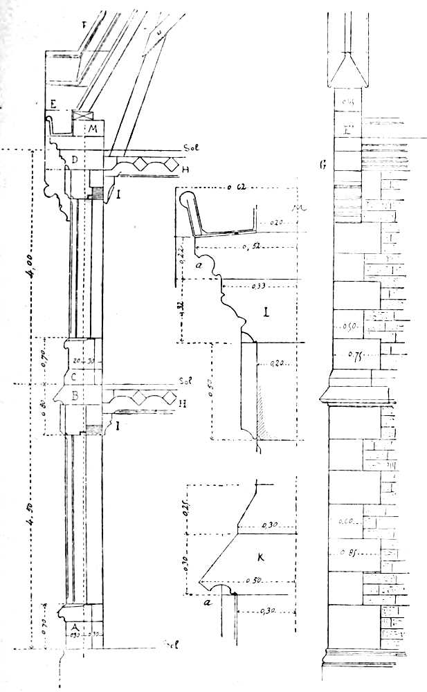 Wall (mur). A gutter-wall is that which carries a gutter and receives the eaves of a roof; a gable-wall that which closes in the timber-work of a roof; a partition-wall that which within a building divides the rooms—takes the bearing of the floors and the chimney-flues.