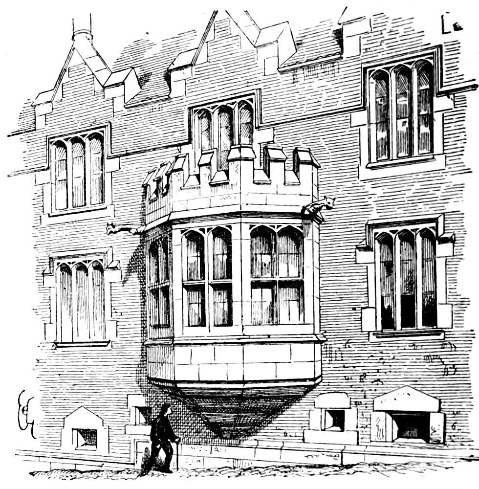 Bay-window (bretêche), a closed and covered balcony or loge, having front and lateral views, forming a projection without and a recess within. When supported on corbels it is termed an oriel.