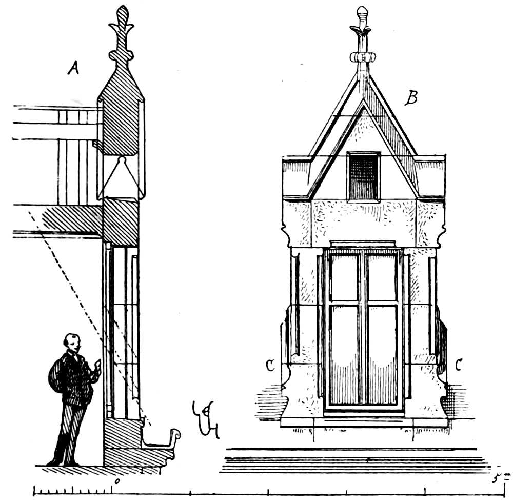 Scale of proportion (échelle de proportion). The text sufficiently explains the use of the scale in architectural drawing, rendering it needless to enlarge on the usefulness of this practical method. By scale is also understood the relative proportions of an edifice. Certain architectural members give the scale of the[Pg 267] whole. Thus, a balustrade ought not to exceed elbow height, nor fall short of it; it then gives the scale of the building, that is to say, it indicates the actual size of the whole, by taking for point of comparison the human height.