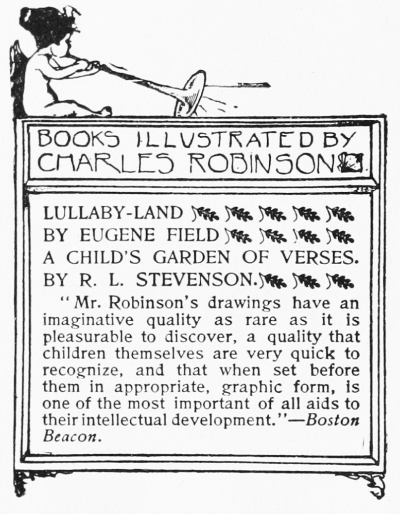 Of this fortunate band was Eugene Field. He knew the country thoroughly, its highways and its byways alike. Its language was the one he was fondest of talking; and he always refused to emigrate and to settle down anywhere else. As soon as he set himself to narrate the goings-on there, those of us who had been tourists in bygone days, but had lost our return-tickets, pricked up our ears, and listened, and remembered, and knew. The Dinkey-Bird, we recollected at once, had been singing, the day we left, in the amfalula-tree; and there, of course, he must have been singing ever since, only we had forgotten the way to listen. Eugene Field gently reminded us, and the Dinkey-Bird was vocal once more, to be silent never again. Shut-Eye Train had been starting every night with the utmost punctuality; it was{10} we who had long ago lost our way to the booking-office (I really do not know the American for booking-office). Now we can hurry up the platform whenever we please, and hear the doors slam and the whistle toot as we sink back on those first-class cushions! And the Chocolate Cat,—why, of course the cats were all chocolate then! And how pleasantly brittle their tails were, and how swiftly, though culled and sucked each day, they sprouted afresh!