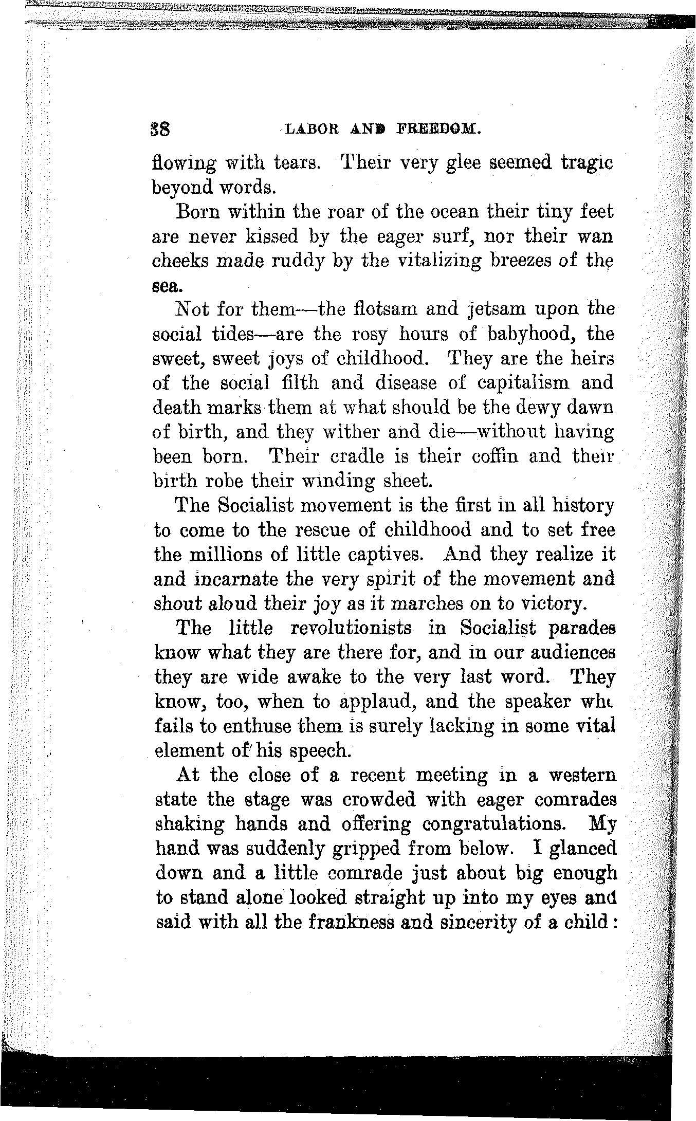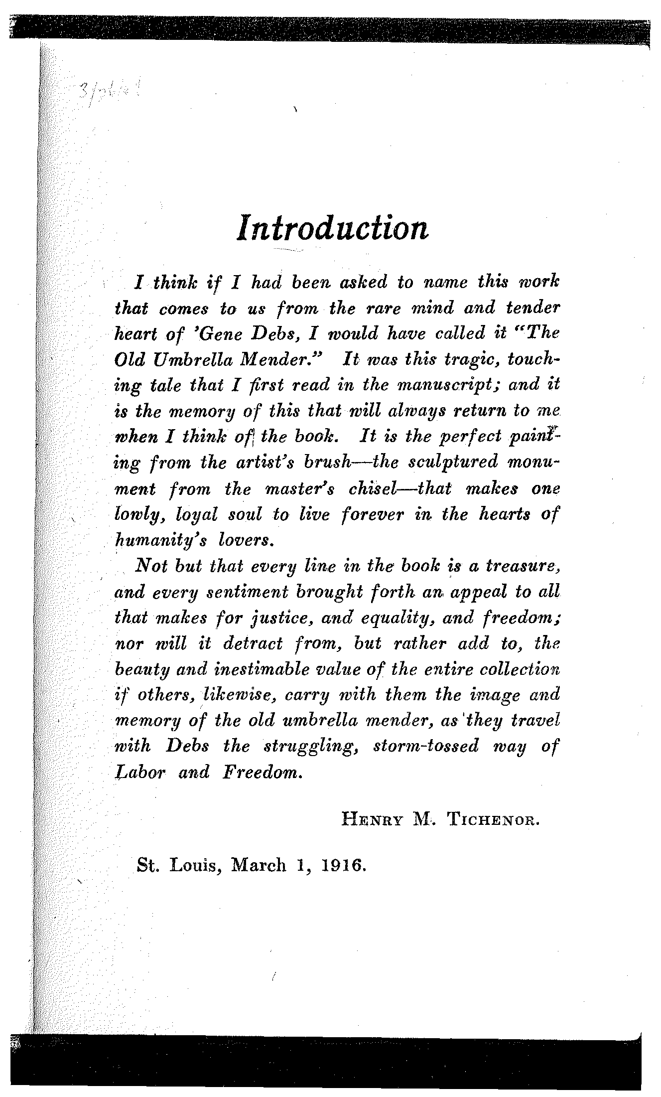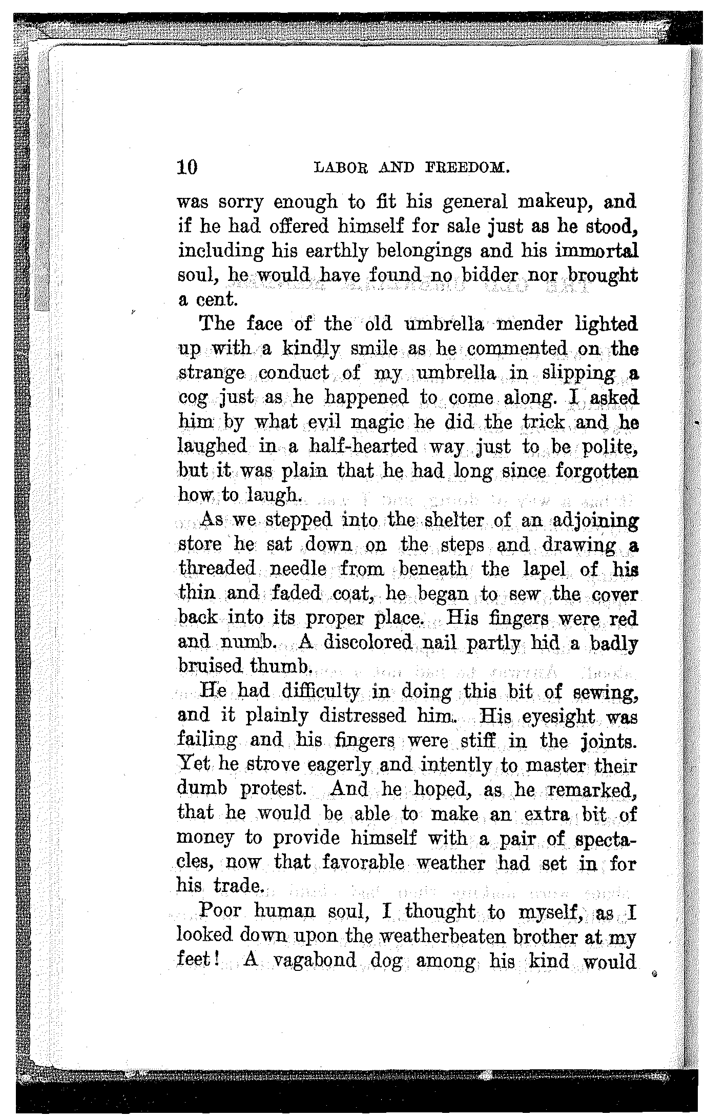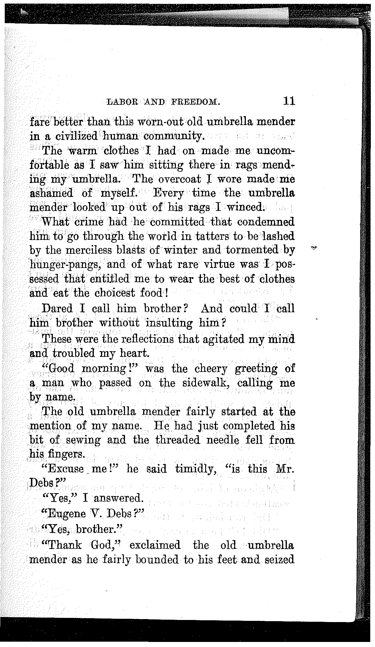 Not but that every line in the book is a treasure, and every sentiment brought forth an appeal to all that makes for justice, and equality, and freedom; nor will it detract from, but rather add to, the beauty and inestimable value of the entire collection if others, likewise, carry with them the image and memory of the old umbrella mender, as they travel with Debs the struggling, storm-tossed way of Labor and Freedom.