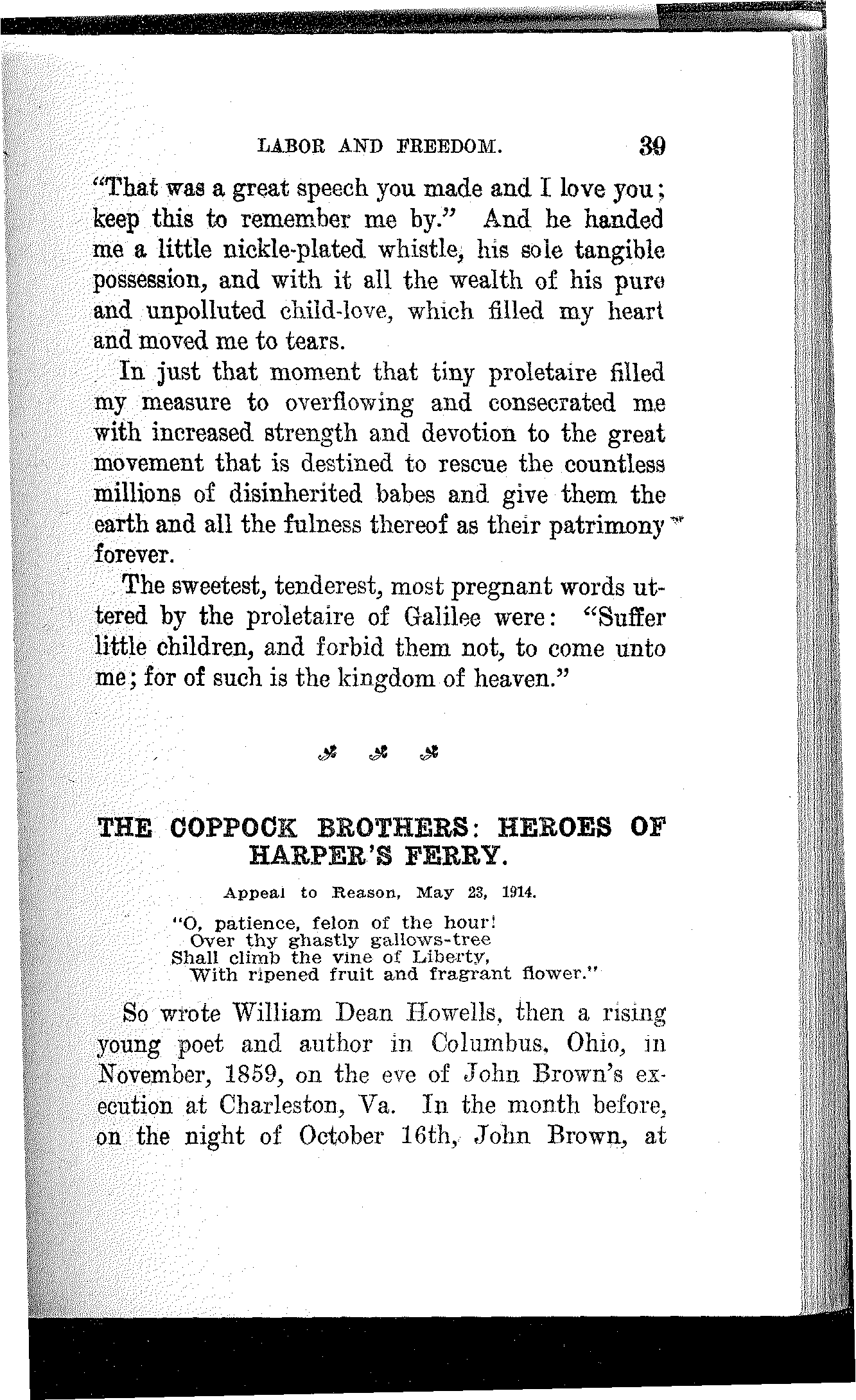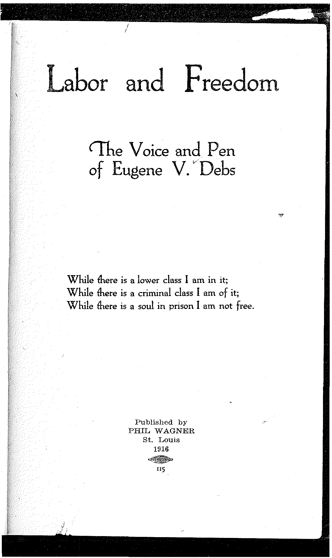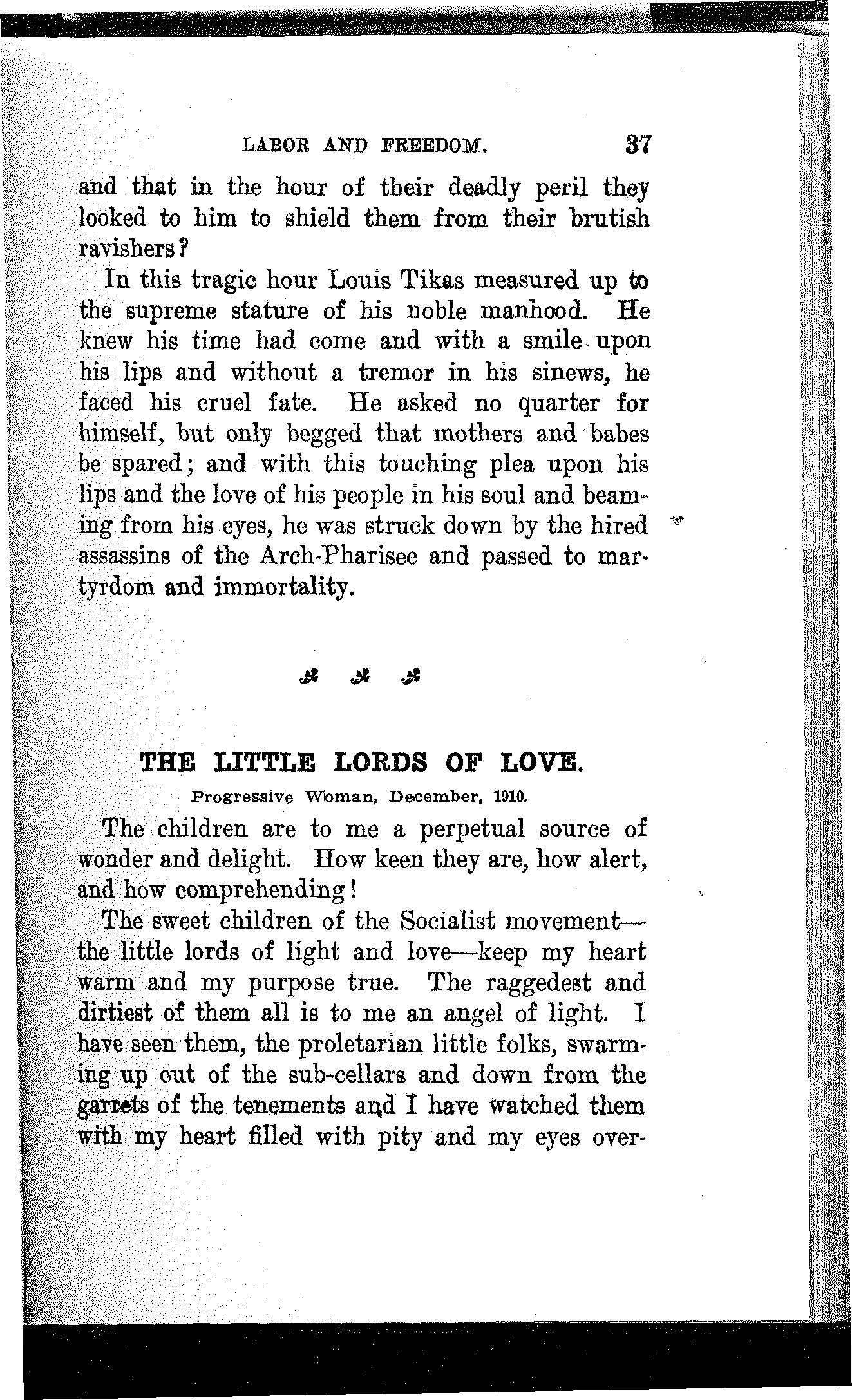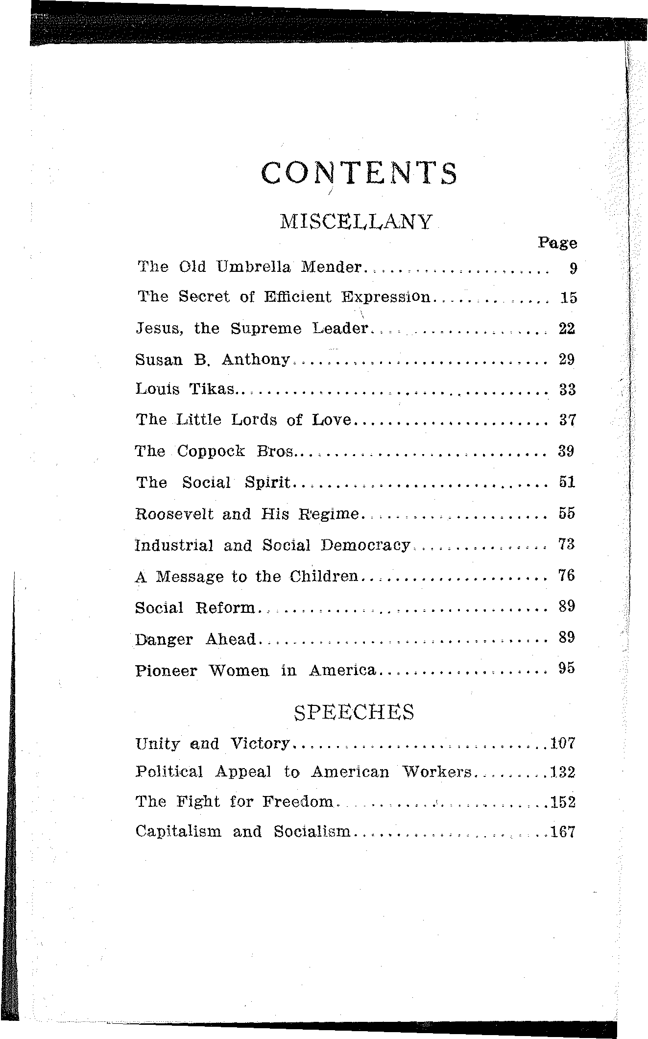 Not but that every line in the book is a treasure, and every sentiment brought forth an appeal to all that makes for justice, and equality, and freedom; nor will it detract from, but rather add to, the beauty and inestimable value of the entire collection if others, likewise, carry with them the image and memory of the old umbrella mender, as they travel with Debs the struggling, storm-tossed way of Labor and Freedom.